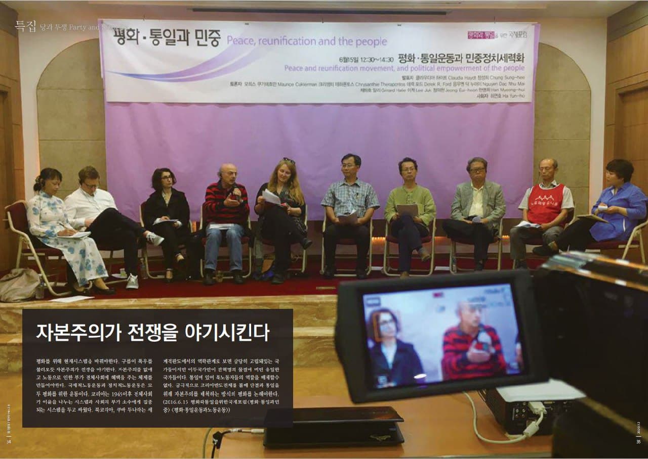 평화를 위해 현재시스템을 바꿔야한다. 구름이 폭우를 불러오듯 자본주의가 전쟁을 야기한다. 자본주의를 없애고 노동으로 인한 부가 전체사회에 혜택을 주는 체제를 만들어야한다. 국제적노동운동과 정치적노동운동은 모두 평화를 위한 운동이다. 코리아는 1945이후 전체사회가 이윤을 나누는 시스템과 사회의 부가 소수에게 집중되는 시스템을 두고 싸웠다. 북코리아, 쿠바 두나라는 세계적판도에서의 역학관계로 보면 상당히 고립돼있는 국가들이지만 이두국가만이 반혁명의 물결에 버틴 유일한 국가들이다. 통일에 있어 북노동자들의 역할을 배제할수 없다. 궁극적으로 코리아반도전체를 볼때 단결과 통일을 위해 자본주의를 배척하는 방식의 평화를 논해야한다. (2016.6.15 평화와통일을위한국제포럼<평화·통일과민중> <평화·통일운동과노동운동>)