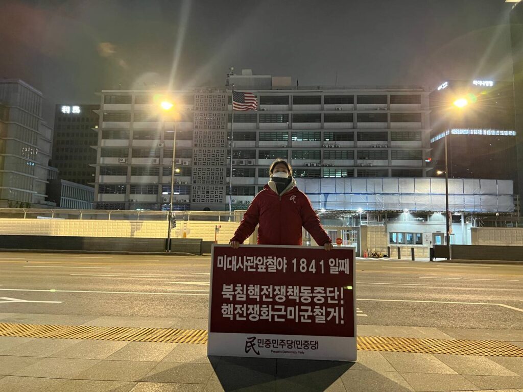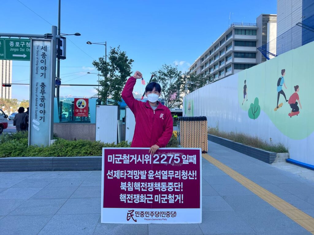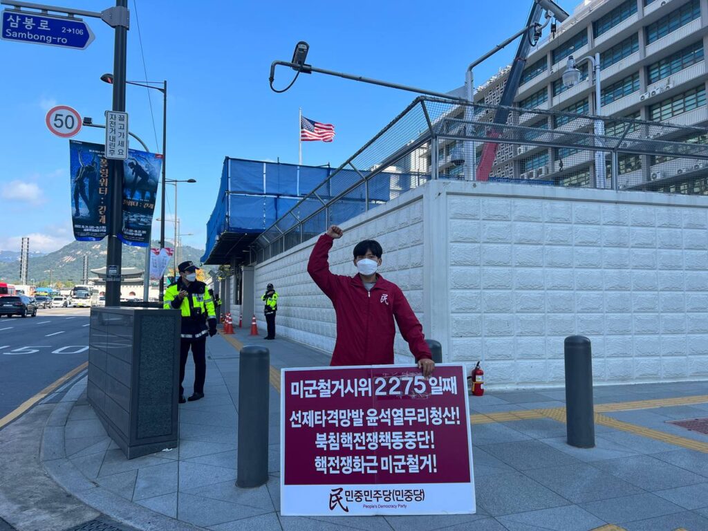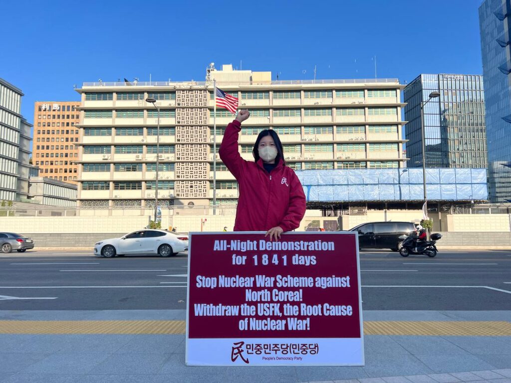 11일 민중민주당(민중당)은 미대사관앞에서 <선제타격망발 윤석열무리청산! 북침핵전쟁책동중단! 핵전쟁화근 미군철거!> 구호를 들고 평화시위를 2275일째 전개했다.