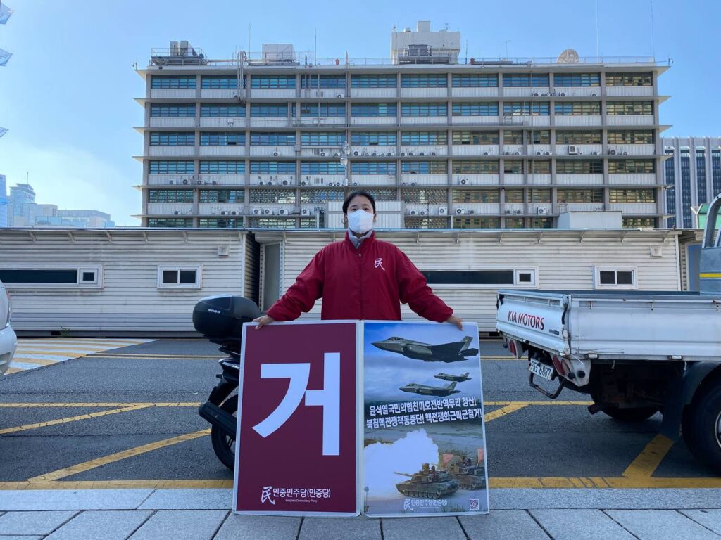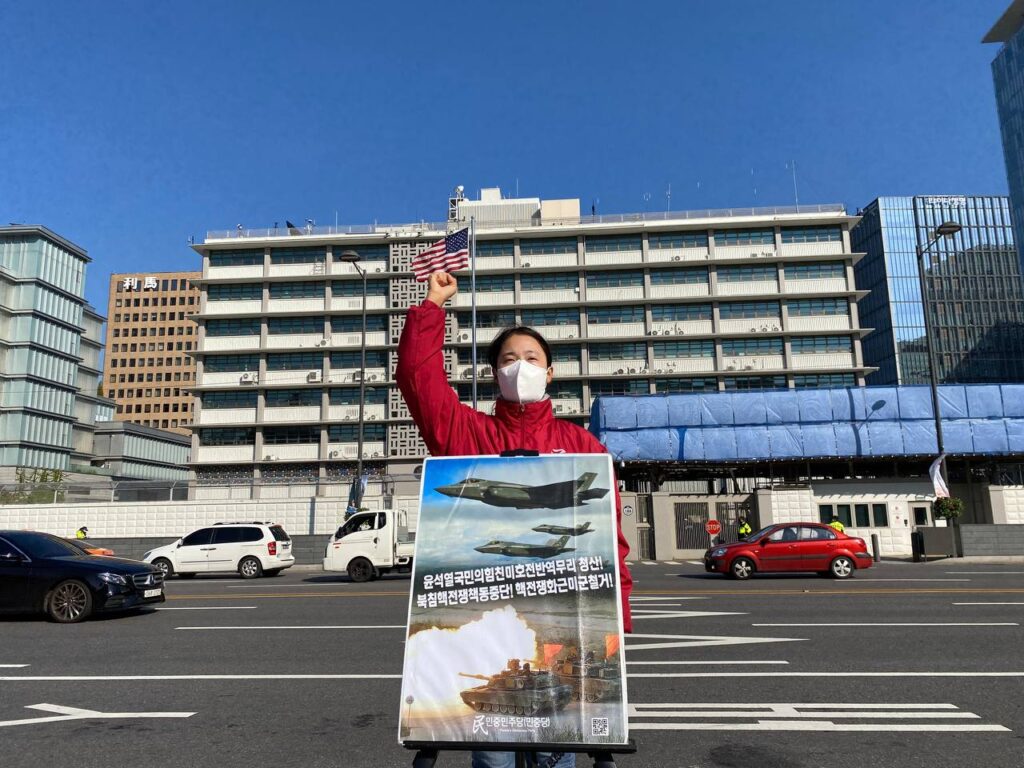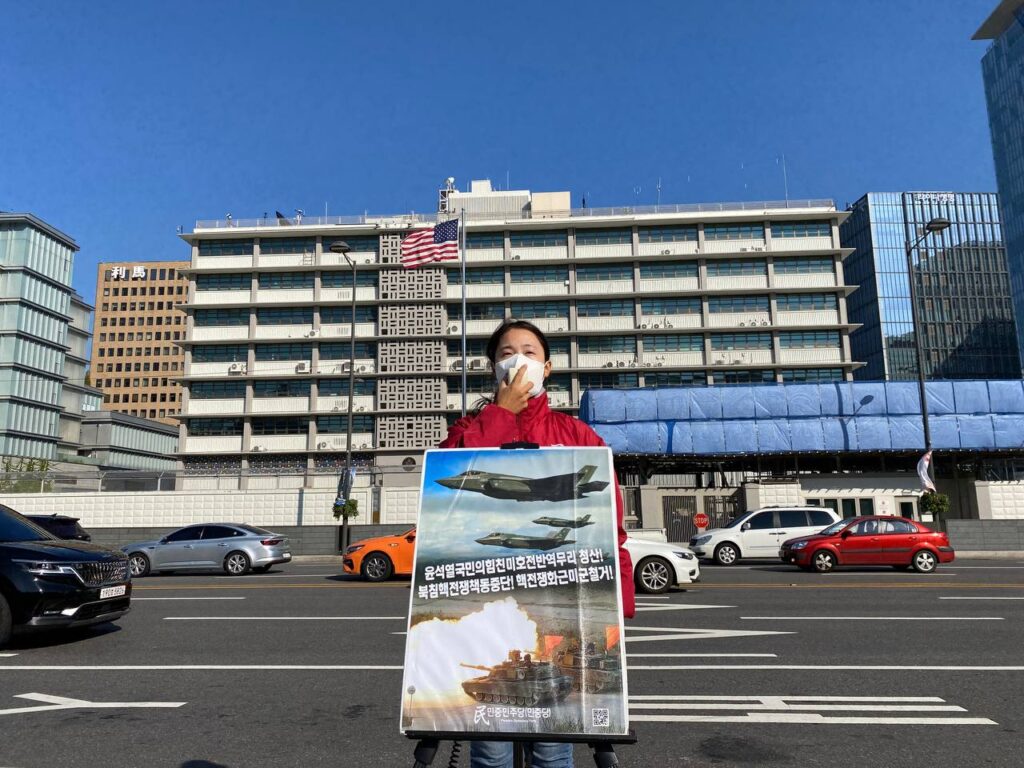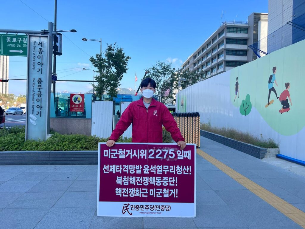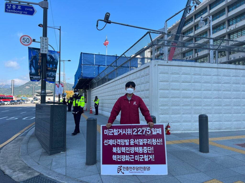 11일 민중민주당(민중당)은 미대사관앞에서 <선제타격망발 윤석열무리청산! 북침핵전쟁책동중단! 핵전쟁화근 미군철거!> 구호를 들고 평화시위를 2275일째 전개했다.