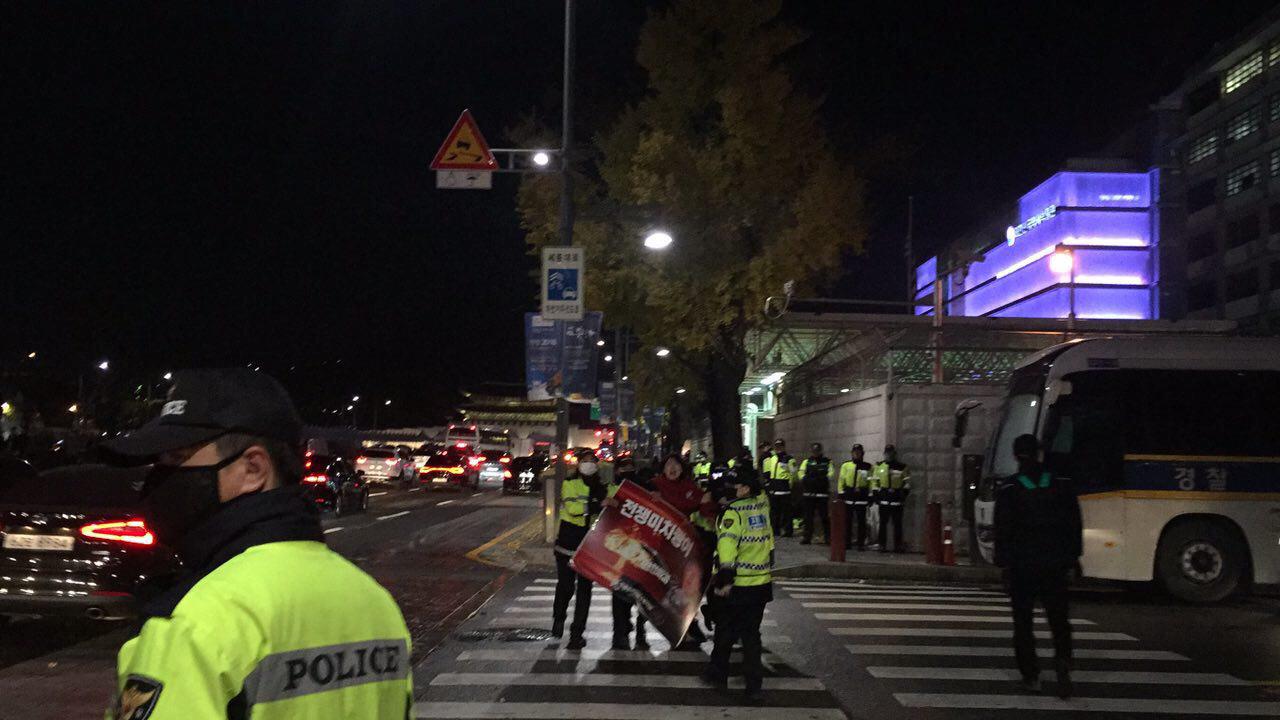 이날 6명의 여경들은 전원이 마스크를 쓴채 학생당원이 들고 있던 <트럼프는 전쟁미치광이> 이미지피시를 붙잡고 양팔을 꽉 낀채 폭력적으로 미대사관 길 건너편으로 강제 이동조치시켰습니다.