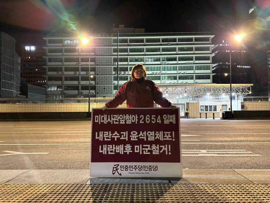 1일 민중민주당(민중당)은 미대사관앞에서 <내란수괴 윤석열체포! 내란배후 미군철거!> 구호를 들고 평화시위를 3087일째 전개했다.