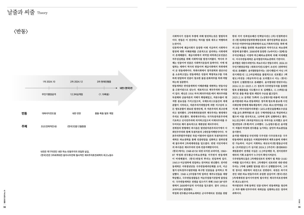 <한국>에서는 1948·49·50 내전·국지전·코리아전, 1960~87 박정희·전두환군사파쇼권력을 거치면서 반동세력이 비대해졌다. <한국>반동의 뿌리는 친일파에 있다. 1945.9 미군정하에 친일파는 친미파로 변신했다. 친미반동세력은 서북청년단등 극우반동테러단체를 조직, 미군철거·단독정부수립반대를 촉구한 민중들을 공격하고 학살했다. 1948 4.3무장봉기에 일떠선 제주도민들을 대량학살했고, 극우반동경찰들은 여순무장봉기진압에 앞장섰다. 극우반동세력은 전쟁을 일으키기 위해 1949 38°선주변에서 2600번이상의 국지전을 일으켰다. 결국 1950.6 코리아전이 발발했다.