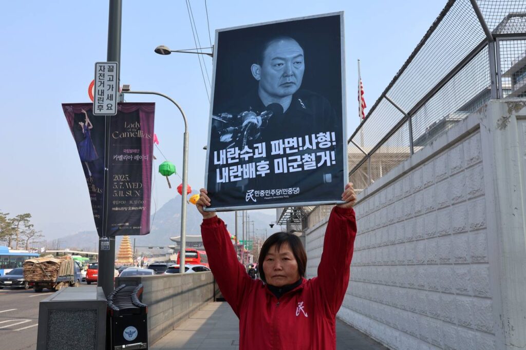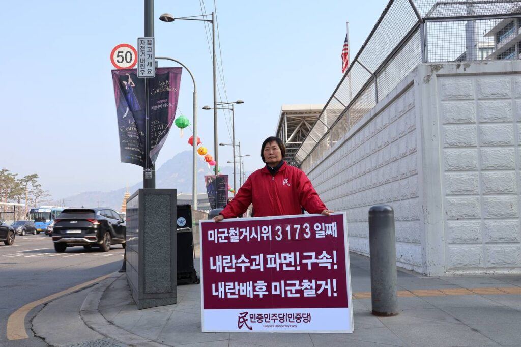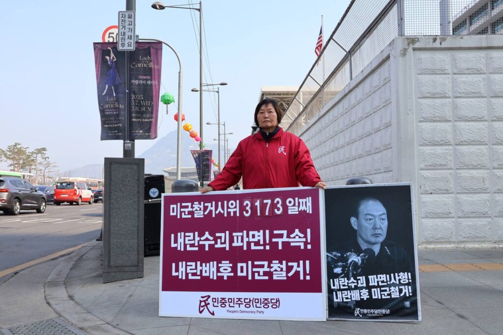 28일 민중민주당(민중당)은 미대사관앞에서 <내란수괴 파면!사형! 내란배후 미군철거!> 구호를 들고 평화시위를 3173일째 전개했다.