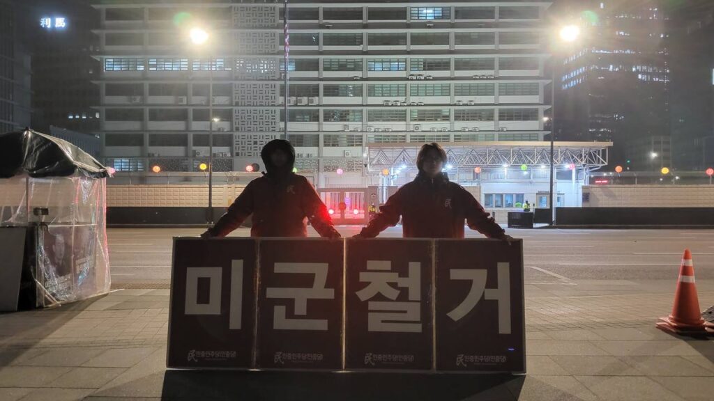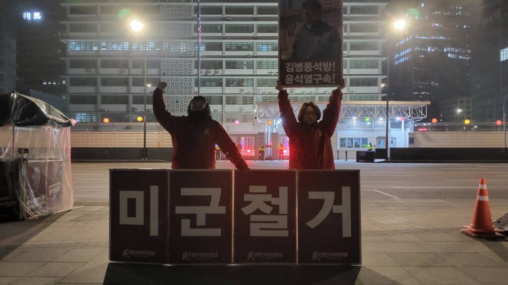 미대사관정문 맞은편에서는 우리말과 영어로 된 구호 <윤석열구속! 내각총사퇴! 내란배후 미군철거!>를 들고 <광화문미대사관앞철야시위>를 진행했다. <김병동석방! 윤석열구속!> 구호도 함께 들었다.