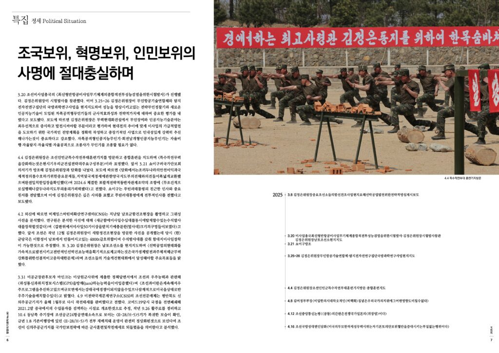 4.4 김정은위원장은 조선인민군특수작전부대훈련기지를 방문하고 종합훈련을 지도하며 <특수작전무력을강화하는것은현시기우리군건설전략의주요구성부문>이라 표명했다. 앞서 3.21 쇼이구러국가안보회의서기가 방조해 김정은위원장과 담화를 나눴다. 보도에 따르면 <담화에서는조러두나라의안전이익과국제적정의를수호하기위한중요문제들,지역및국제정세에관한양국지도부의견해와의견들이폭넓게교환됐으며완전일치한입장을확인했다>며 2024.6 체결한 포괄적전략적동반자관계조약의 조항에 <무조건적으로실행해나갈두나라지도부의용의가피력됐다>고 전했다. 쇼이구는 푸틴러대통령의 친근한 인사와 중요친서를 전달했으며 이에 김정은위원장은 깊은 사의를 표했고 푸틴러대통령에게 전투적인사를 전했다고 보도됐다.