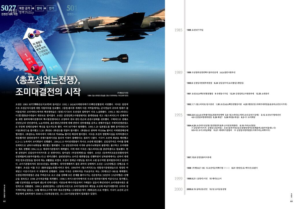 조선은 1985 NPT(핵확산금지조약)에 들어갔고 1992.1 IAEA(국제원자력기구)핵안전협정에 서명했다. 미국은. 일방적으로 조선군사시설에 대한 사찰의무를 강요했다. <냉전>종식후 세계의 다른 지역들에서는 군사연습의 규모와 범위가 줄어들었지만 코리아반도에서의 핵전쟁연습은 <냉전>시기보다 호전성과 침략성이 더욱 노골화됐다. 1993.3 <팀스피리트> 미<한>합동군사연습이 대규모로 벌어졌다. 조선은 김정일최고사령관명의로 중대방송을 내고 <팀스피리트>가 선제타격을 위한 침략적예비전쟁이며 핵시험전쟁이라고 규정하며 전국·전민·전군의 준전시상태를 선포했다. 구체적으로 전체조선인민군과 인민경비대, 노농적위대, 붉은청년근위대에 대해 만반의 전투태세를 갖추고 전체주민들은 주체적전쟁관점으로 무장해 경제건설에서 혁신을 일으키도록 했다. 이어 NPT에서 탈퇴했다. 1993.5.29 일본열도를 향해 중거리탄도미사일<화성7>을 발사했고 5.30 <화성8>·<화성9>를 연달아 발사했다. <화성8>은 괌북쪽 약100㎞ 떨어진 서태평양해상에 떨어졌다. <화성9>는 하와이에서 서쪽으로 약400㎞ 떨어진 해상에 떨어졌다. 미국은 조선의 영변핵시설을 타격하겠다고 대응했지만 클린턴정부가 전쟁시뮬레이션을 돌리자 미측이 참패한다는 결과가 나왔다. 미국이 조선에 회담을 제안했고 6.2~11 뉴욕에서 조미회담이 진행됐다. 1994.6.15 카터전대통령이 특사로 조선에 방문했다. 김일성주석은 카터를 통해 전격적으로 남북수뇌회담을 제안했고 합의됐다. 7.8 김일성주석의 서거와 남북수뇌회담의 불발에도 불구하고 조미대화는 계속 진행돼 1994.10.21 제네바기본합의가 채택됐다. 이에 따라 미국은 <팀스피리트>를 중단하겠다고 발표했다. 한편 김영삼이 김일성주석서거이후 곧 전쟁이라도 일어날듯 <비상경계령>을 내렸다. 조선은 <동족끼리조문은못할망정비상경계를펴고총부리를대느냐>고 맹비난했다. 클린턴정부는 조미간 평화협상을 진행하면서 남북관계에서는 남측이 대대적인 반조선망동을 벌이게하는 교활함을 보였다. 조선이 경제난·식량난을 겪으며 소련·동구처럼 붕괴될것이라고 본것이다. 조미기본합의서의 경수로건설도 태만했다. 대자연재해까지 겹친 최악의 상태에서 조선은 <고난의행군>·강행군을 시작했다. 조선은 이를 두고 <총포성없는전쟁>이라고 한다. 1994부터 <팀스피리트>는 연합전시증원연습으로 명칭만 바꿔달고 이전시기보다 더 위험하게 강행됐다. 1998 미국은 선제타격을 주요골자로 하는 <작계5027-98>을 채택했다. 김정일국방위원장은 군을 주력군으로 보고 군을 강화해 모든 문제를 풀어나가는 선군정치로 3년간의 <고난의행군>·강행군을 결속짓고 1998 군사적공세를 재개했다. 1998.5 파키스탄사막에서의 수소탄·원자탄시험에 비공식으로 참가했고, 8월 인공위성을 쏘아올려 궤도에 안착시켰다. 미본토에 핵미사일공격이 가해질수 있음이 확인되면서 조미대결국면은 결정적으로 전환됐다. 1999.3 클린턴정부는 <금창리>사건으로 조미기본합의의 책임을 조선에 떠넘기려했지만 오히려 정치적타격을 입었고, 10월 페리보고서에 따라 대조선정책을 <고립압살>에서 <평화공존>으로 바꿨다. 미국이 조선의 군사적공세에 굴복하면서 2000 6.15남북공동선언, 10.12조미공동성명이 발표될수 있었다.