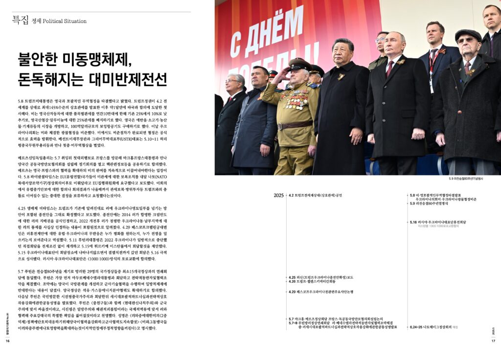 5.7 푸틴은 전승절80주년을 계기로 방러한 29명의 국가정상들중 최소15개국정상과의 연쇄회담에 돌입했다. 푸틴은 가장 먼저 마두로베네수엘라대통령과 회담하고 전략적동반자및협력조약을 체결했다. 조약에는 양국이 국방관계를 개선하고 군사기술협력을 수행하며 일방적제재에 반대한다는 내용이 담겼다. 양국정상은 석유·가스등에너지분야협력도 확대하기로 합의했다. 다음날 푸틴은 국빈방문한 시진핑중국가주석과 회담한뒤 새시대포괄적파트너십과전략적상호작용강화에관한공동성명을 발표했다. 푸틴은 <중친구들>과 함께 <현대판신나치주의>와 군국주의에 맞서 싸울것이라고, 시진핑은 일방주의와 패권적괴롭힘이라는 국제적역류에 맞서 러와 협력해 주요강대국의 특별한 책임을 짊어질것이라고 천명했다. 성명은 <러와중에대한미의<2중억제>정책에단호히대응하기위해양국이협력을강화하고군사협력도지속할것>·<미와그동맹국들이러와중주변에나토영향력을확대하는것이지역안정에부정적영향을끼친다>고 명시했다.
