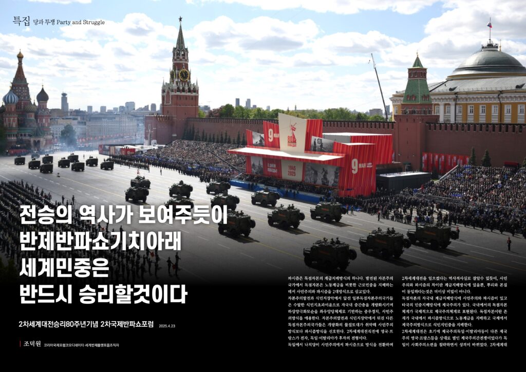2차세계대전에서 승리한 역사, 전승절80주년을 앞둔 오늘의 현실이 입증하듯이, 세계반제진영의 승리는 확정적이다. 반제반파쇼의 기치를 높이 들고 투쟁하는 세계민중의 최후승리는 과학이다.