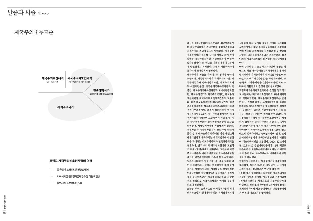 이미 구조화된 모순을 내포하고있어 멸망을 필연으로 하는 제국주의는 2차세계대전후의 사회주의세력내 기회주의세력의 파산을 <냉전>으로 이겼다고 여기며 <신냉전>을 추진하고있다. 조선·중국·러시아·이란을 <신침략자의축>으로 모략하며 사활적으로 전쟁에 끌어들이고있다.