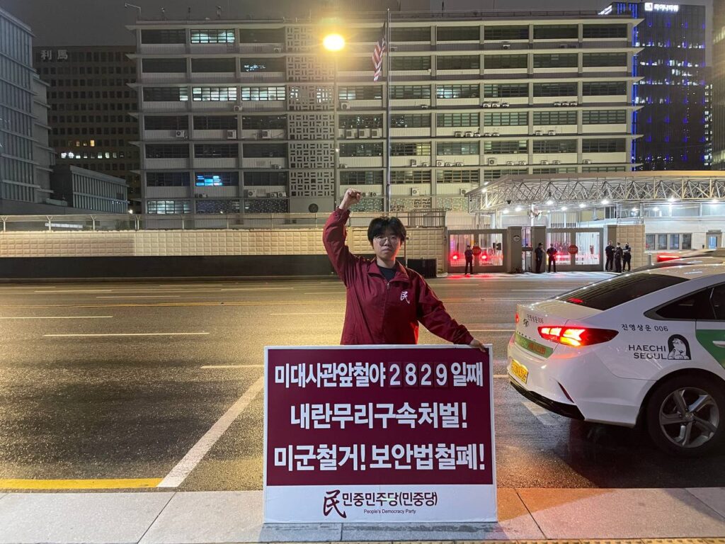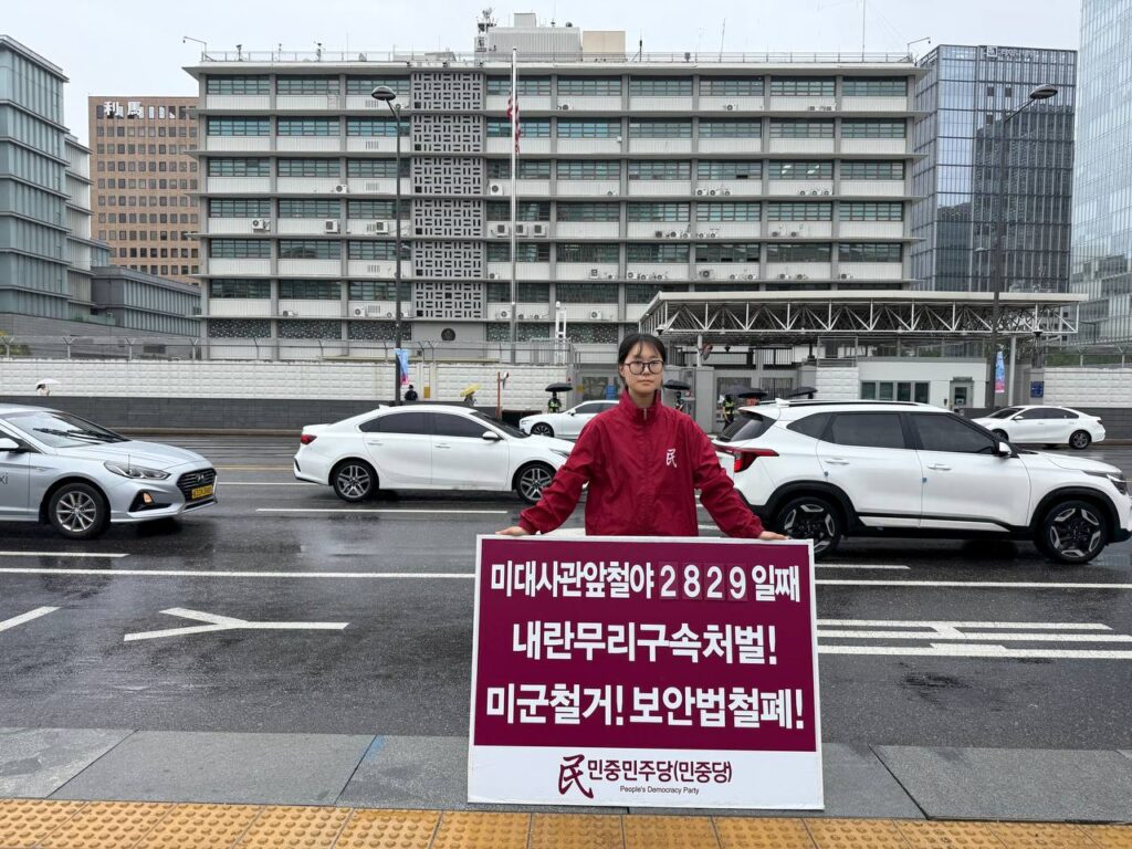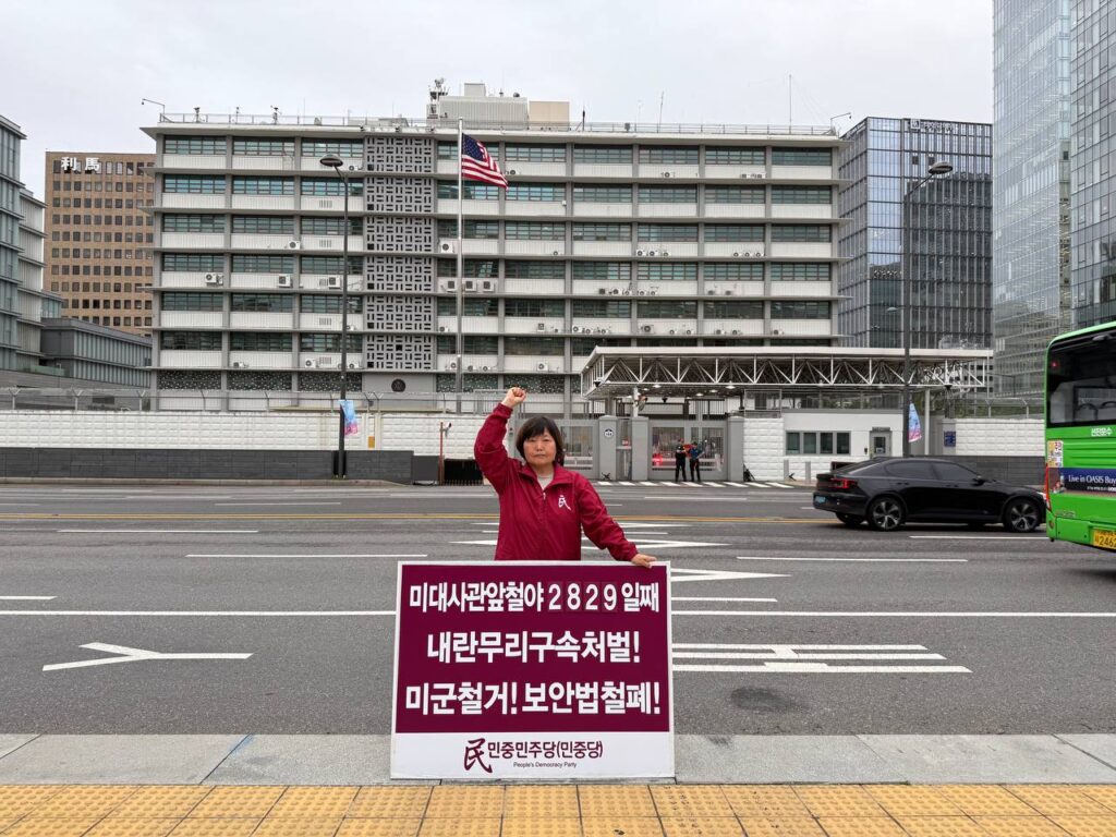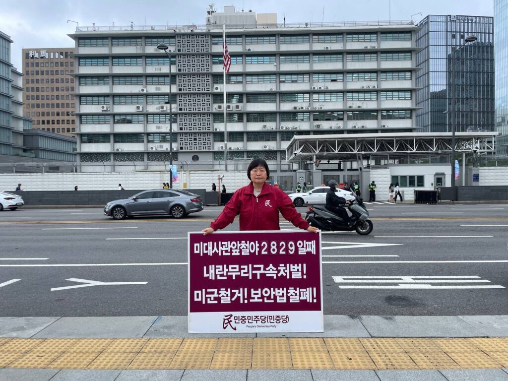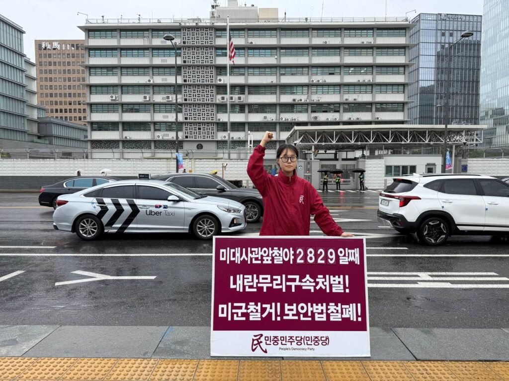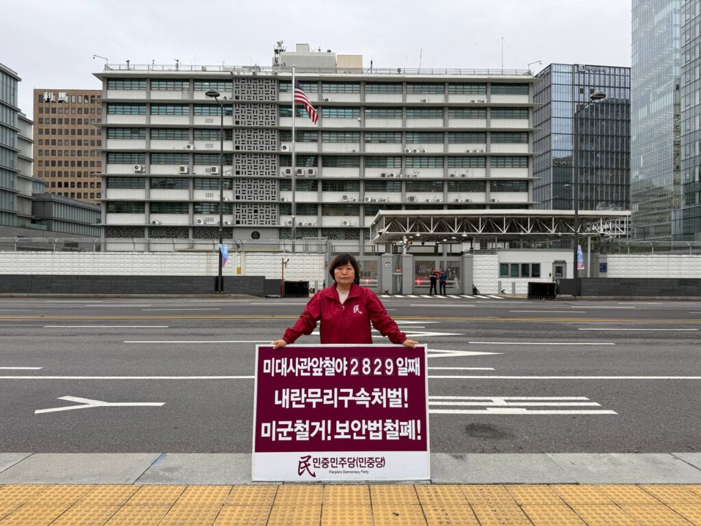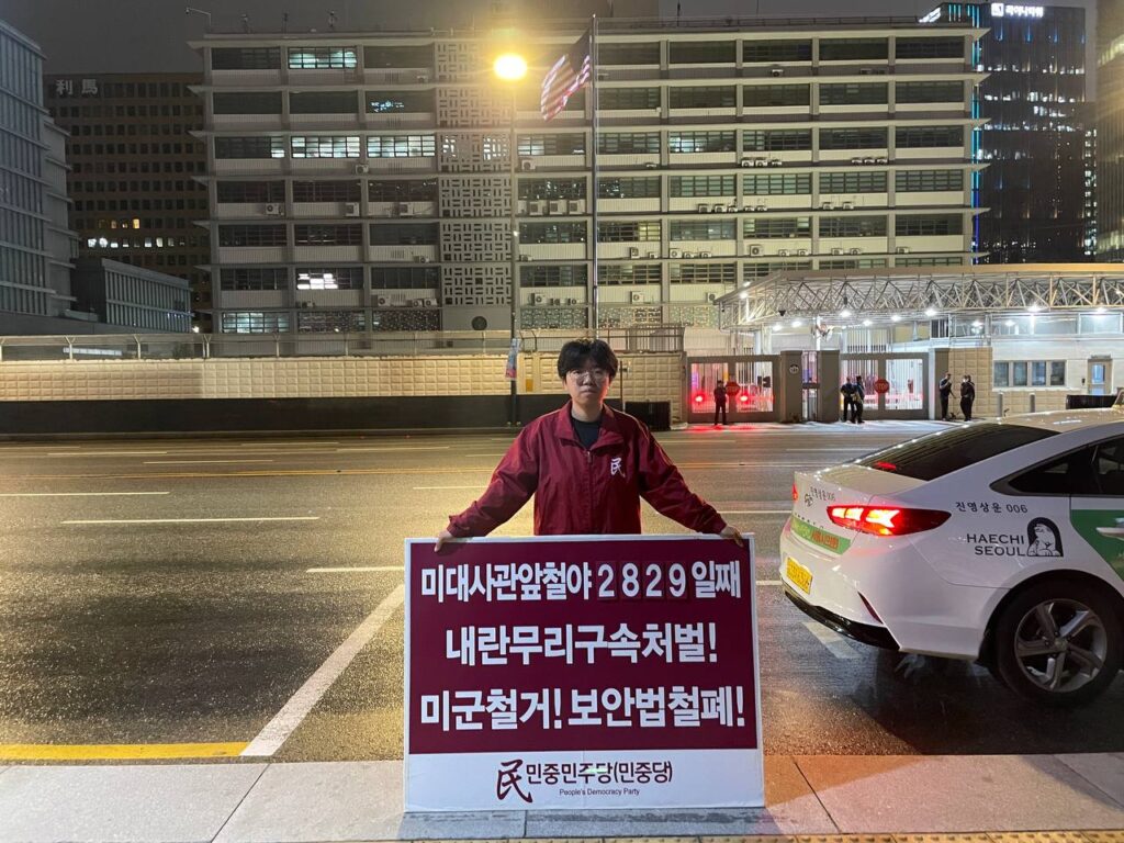 25일 민중민주당(민중당)은 미대사관앞에서 <내전책동 내란무리처벌! 전쟁책동 미군철거!> 구호를 들고 평화시위를 3262일째 전개했다.