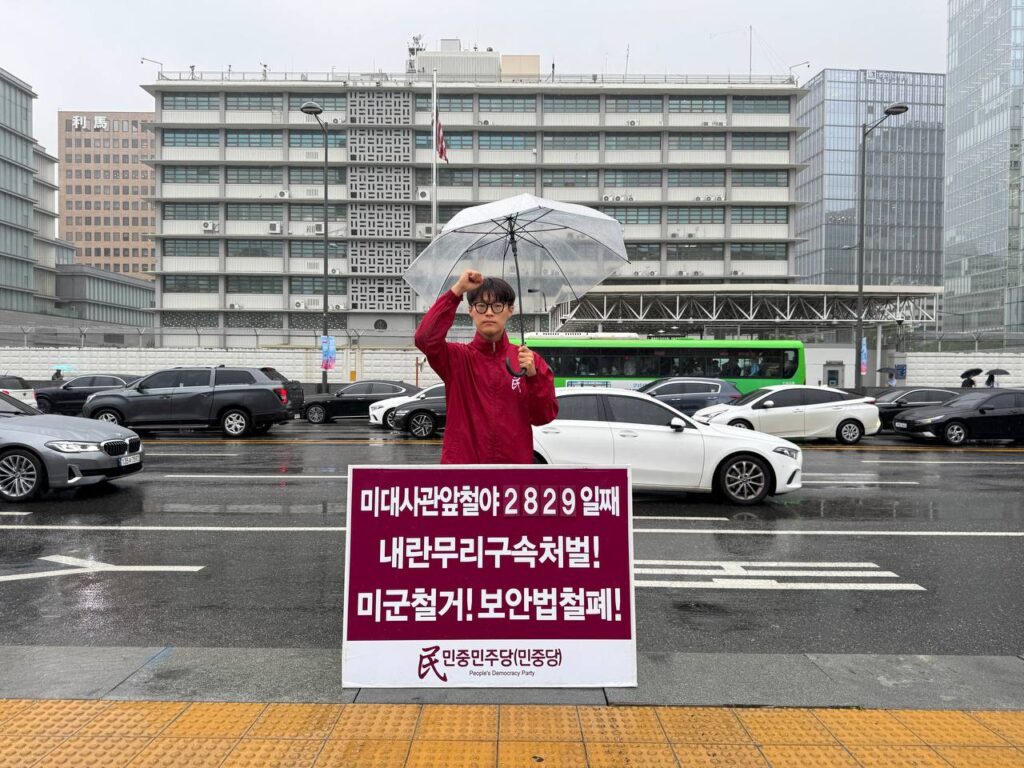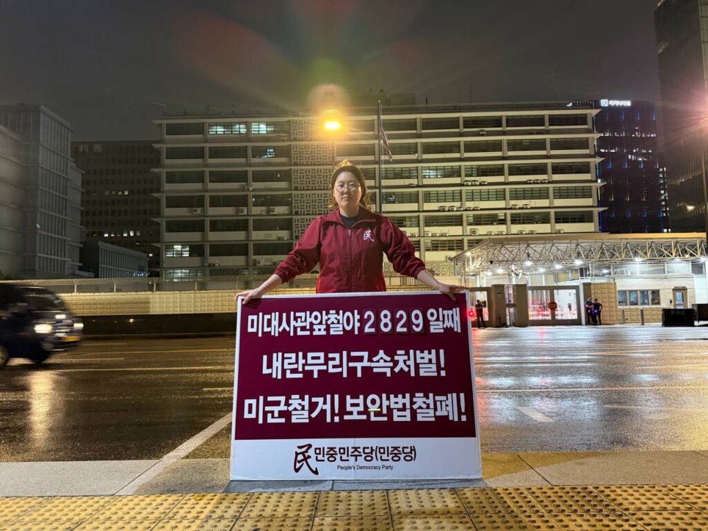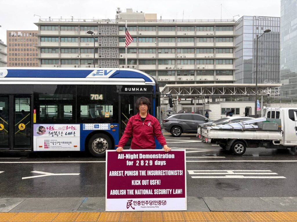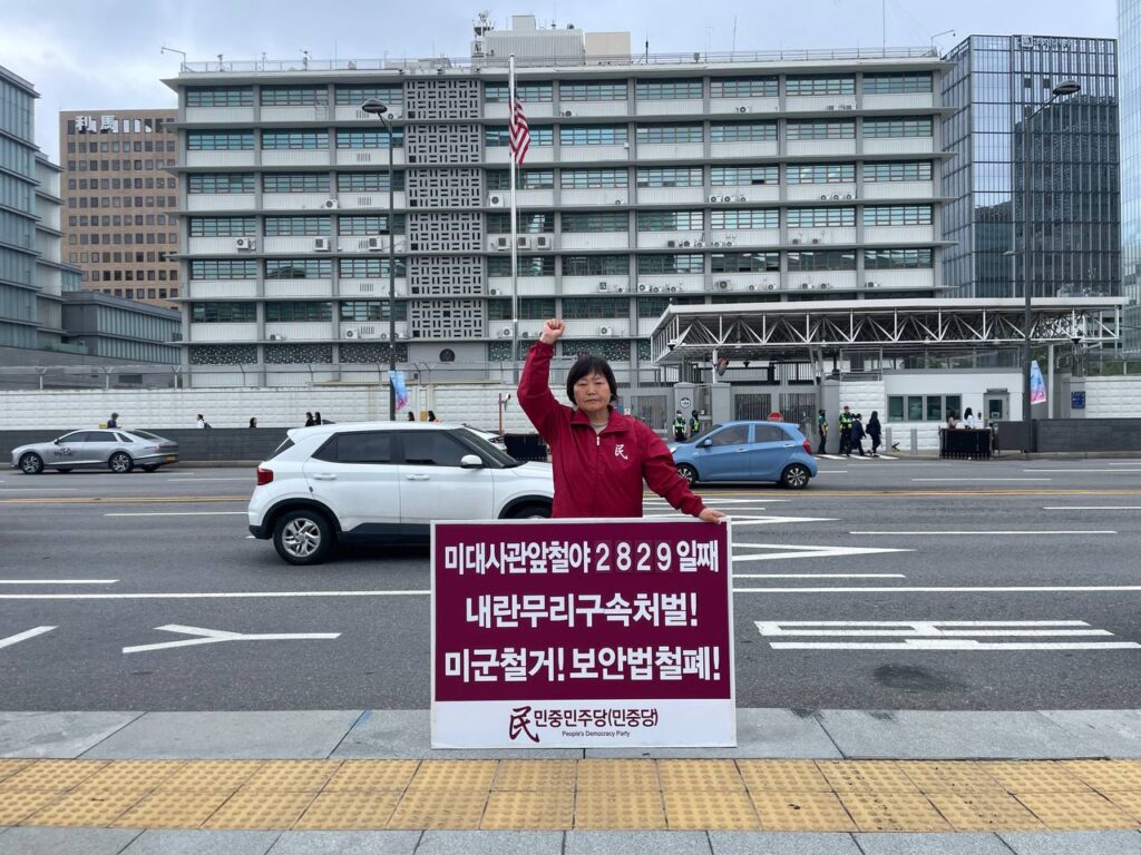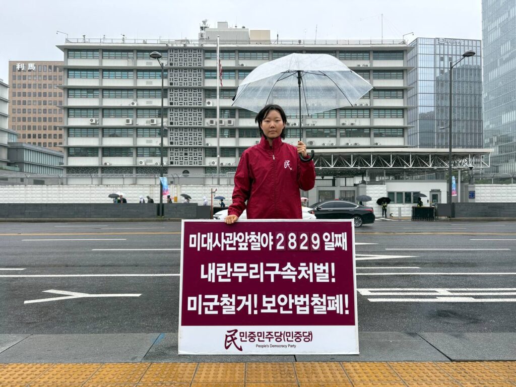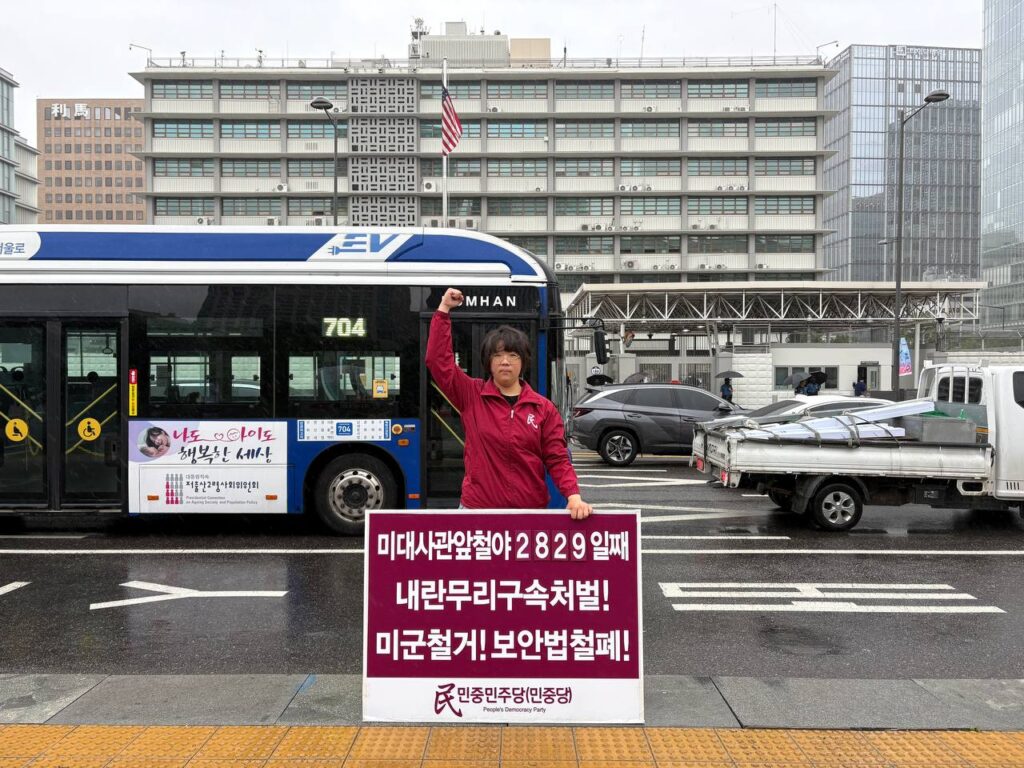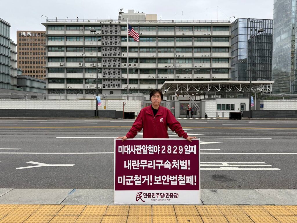 25일 민중민주당(민중당)은 미대사관앞에서 <내전책동 내란무리처벌! 전쟁책동 미군철거!> 구호를 들고 평화시위를 3262일째 전개했다.