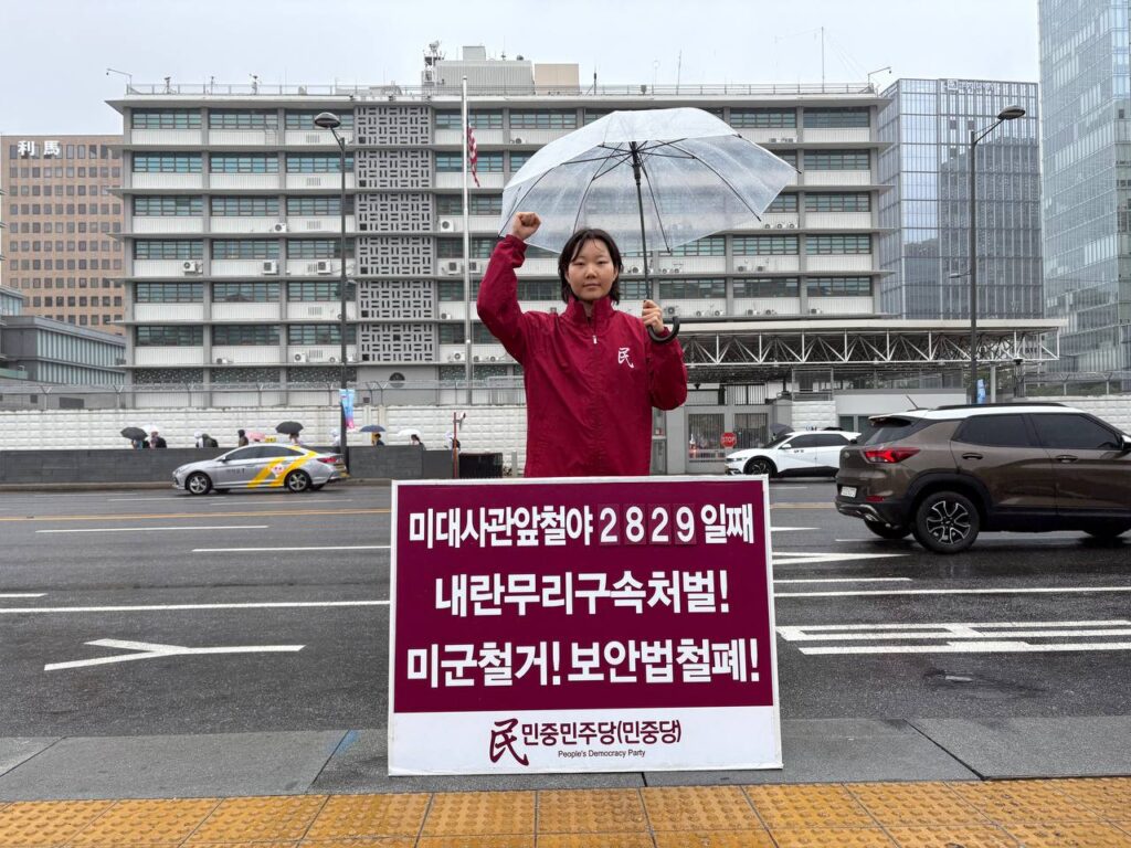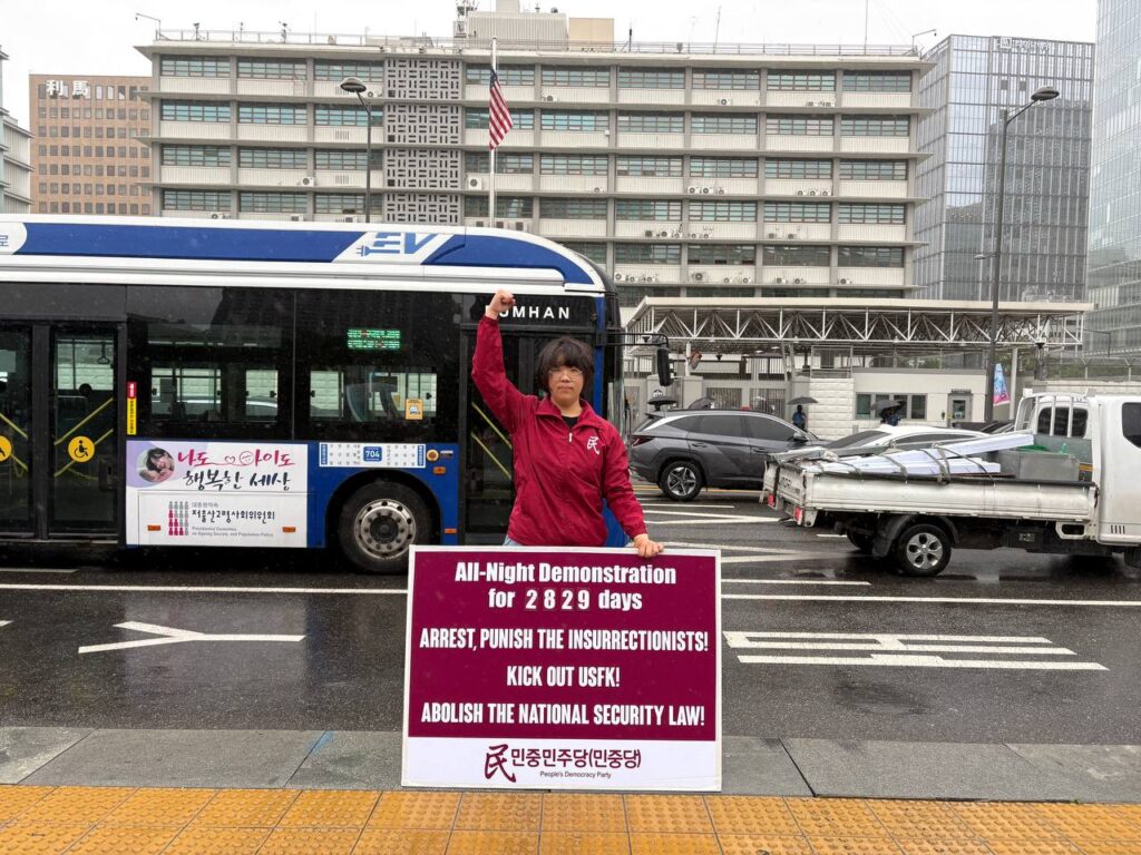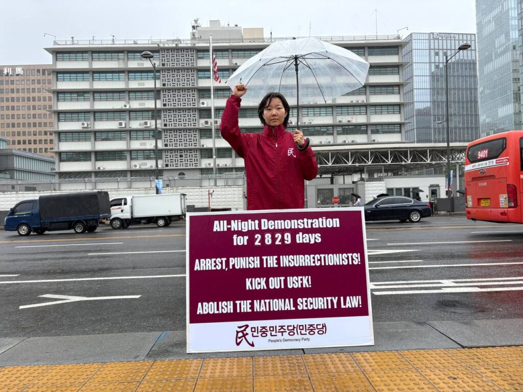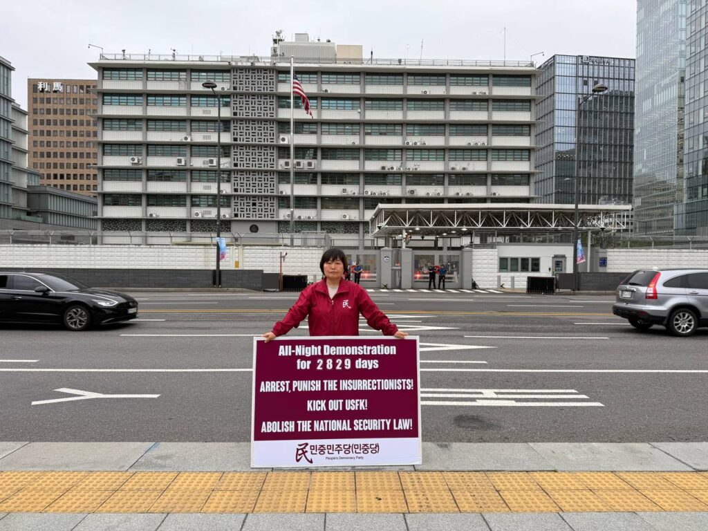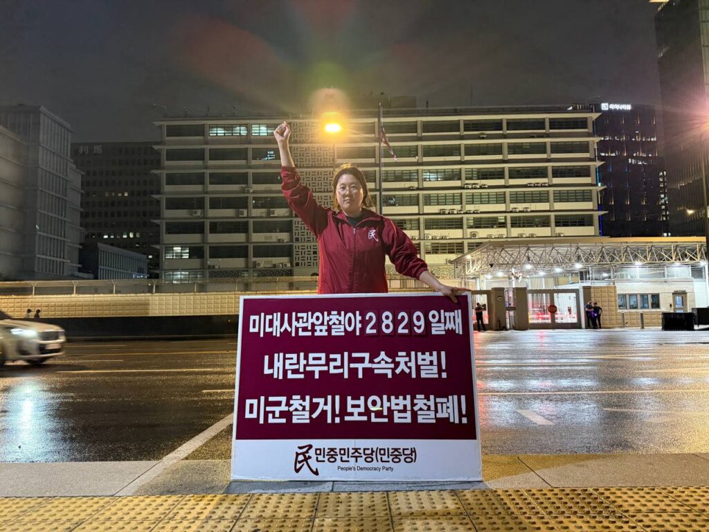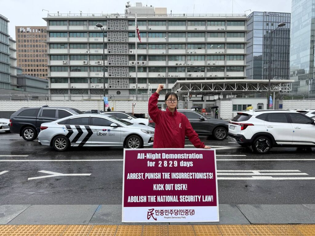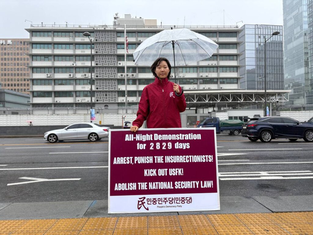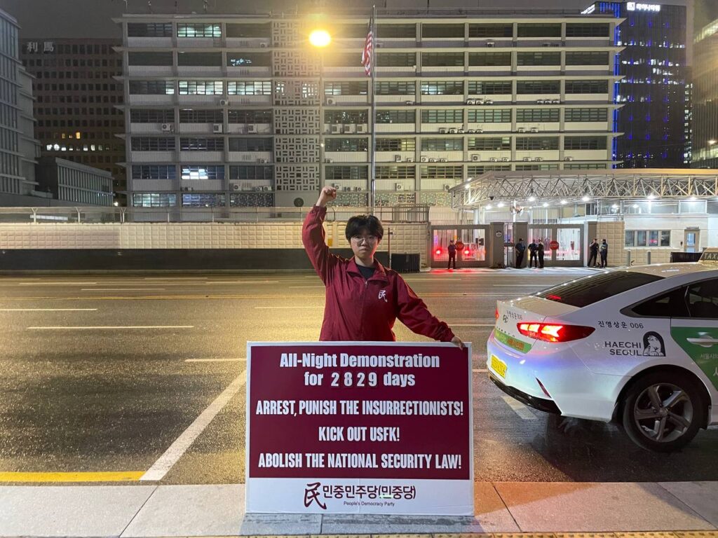 25일 민중민주당(민중당)은 미대사관앞에서 <내전책동 내란무리처벌! 전쟁책동 미군철거!> 구호를 들고 평화시위를 3262일째 전개했다.