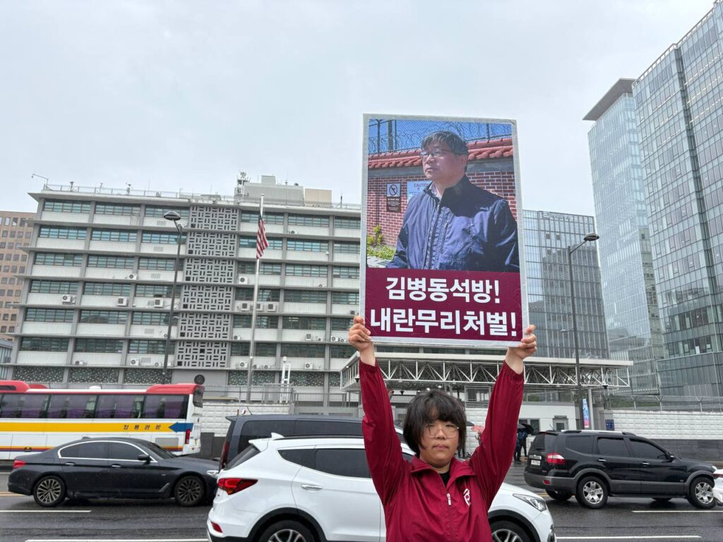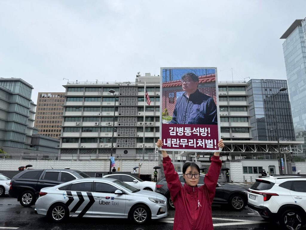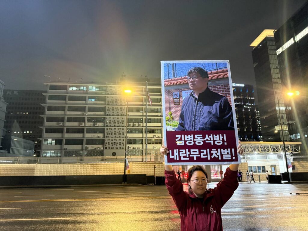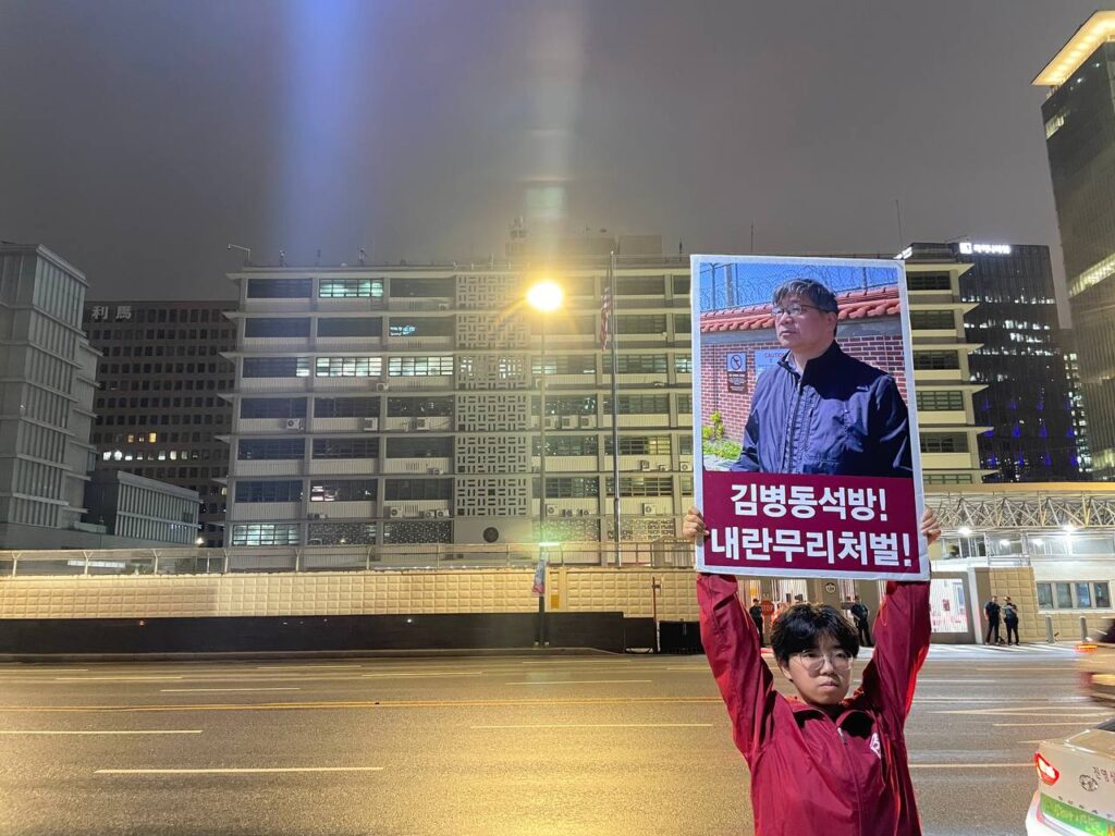 미대사관정문 맞은편에서는 우리말과 영어로 된 구호 <내란무리구속처벌! 미군철거! 보안법철폐!>를 들고 <광화문미대사관앞철야시위>를 진행했다. <김병동석방! 윤석열구속!> 구호도 함께 들었다.