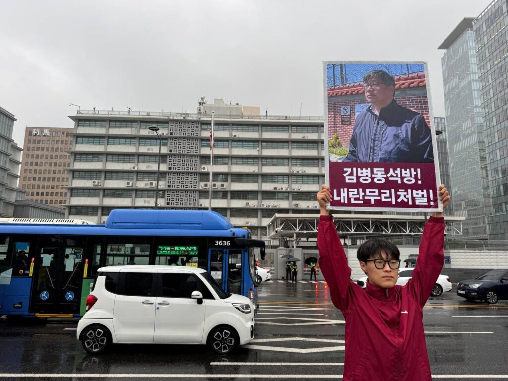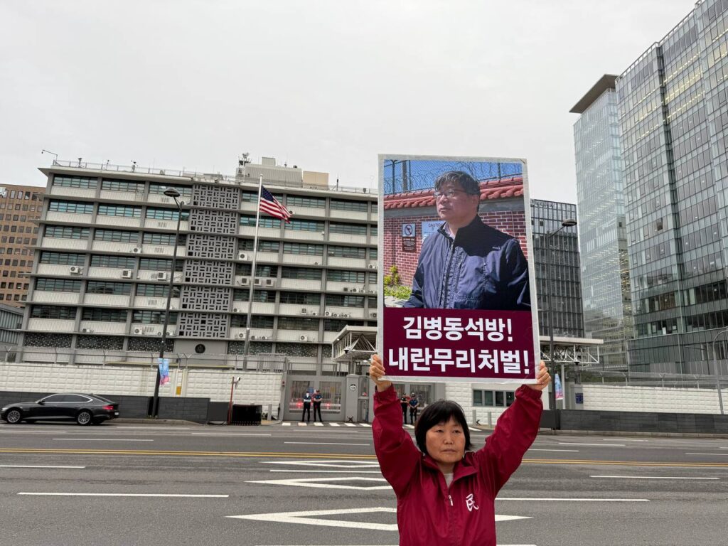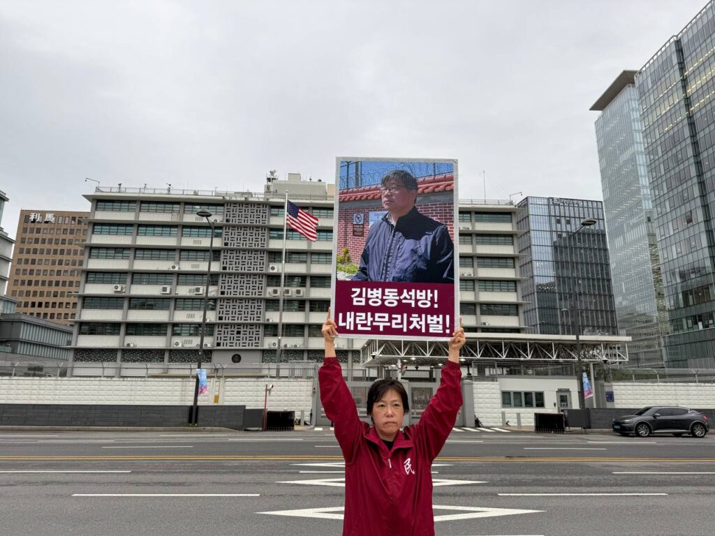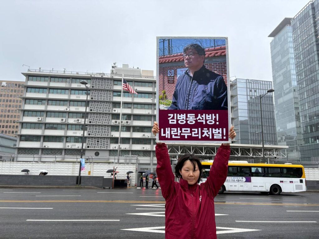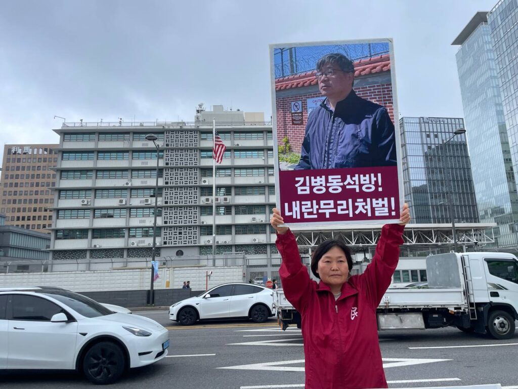 미대사관정문 맞은편에서는 우리말과 영어로 된 구호 <내란무리구속처벌! 미군철거! 보안법철폐!>를 들고 <광화문미대사관앞철야시위>를 진행했다. <김병동석방! 윤석열구속!> 구호도 함께 들었다.