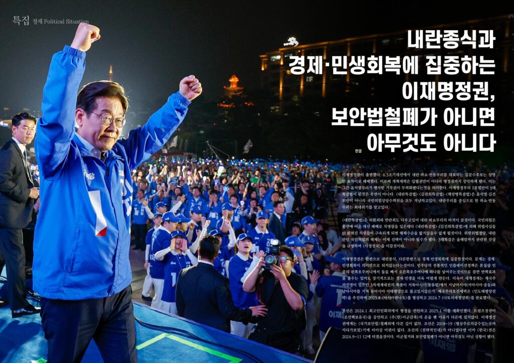 이재명정권은 한편으로 내란종식, 다른한편으로 경제·민생회복에 집중할것이다. 문제는 경제·민생회복이 의지만으로 되지않는다는것이다. 민주당의 전통적인 인플레이션정책은 본질상 민중의 왼쪽호주머니에서 둘을 빼서 오른쪽호주머니에 하나를 넣어주는것이므로 잠깐 반짝효과를 볼수는 있어도 장기적으로는 경제·민생을 더욱 어렵게 만든다. 더욱이 세계정세는 제국주의진영이 일으킨 3차세계대전의 폭풍이 서북아시아(동유럽)에서 서남아시아(서아시아·중동)와 남아시아를 거쳐 동아시아·서태평양으로 불고있지않은가. 제국주의호전세력은 <인도태평양전략>을 추진하며 2023.8 <아시아판나토>를 형성하고 2024.7 <나토의태평양화>를 완료했다.