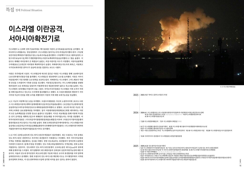 6.21 미군이 이란핵시설 3곳을 타격했다. 트럼프미대통령은 자신의 소셜미디어에 <포르도·나탄즈·이스파한등이란의3개핵시설에대한매우성공적인공격을완료했다>·<모든항공기는현재이란영공을벗어났으며주공격대상인포르도에폭탄을완전투하했다>고 밝혔다. 보도에 따르면 미군은 벙커버스터폭탄 GBU관통폭탄을 투하했다. 앞서 이란편의판단위원회(IRC)위원 레자에이는 이란의 모든 농축핵물질을 안전한 장소로 옮겼다고 언급했다. 미국은 외교채널을 통해 이란에 자신들은 단지 공격만을 계획하고있으며 테헤란의 정권교체를 추구하지않는다는 의사를 전달했다. 아락치이란외무장관은 <미국의공격이광범위한결과를초래할것>이라며 <이란은자기방어권을행사할권리를보유>하고있다고 목소리를 높였다. 한편 호세인전독일주재이란대사는 <이스라엘은이란을상대로10일간의군사작전을실패했을뿐만아니라패배직전까지몰렸다>·<이스라엘이위기에처하지않았다면미국은개입하지않았을것>이라고 분석했다.