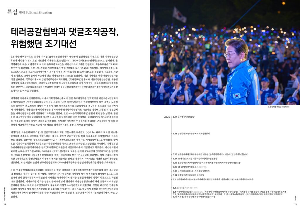 6.3 계엄·탄핵정국으로 조기에 치러진 21대대통령선거에서 내란종식·민생회복을 사명으로 내건 이재명민주당후보가 당선됐다. 6.4 오전 개표결과 이재명49.42%·김문수41.15%·이준석8.34%·권영국0.98%로 집계됐다. 윤석열파면에 따른 보궐선거로 치러져 본투표종료시간은 기존선거에서 2시간 연장됐다. 최종투표율은 79.4%로 28년만에 최고치다. 5.29~30 진행된 사전투표율은 역대 2번째로 높은 37.4%를 기록했다. 이재명대통령은 총1728만7513표를 득표해 20대대선에서 윤석열이 얻은 최다득표기록 1639만4815표를 경신했다. 득표율은 과반에 못미쳤고, 18대대선에서 박근혜가 얻은 최다득표율 51.55%를 못넘었다. 이날 이재명은 내각·대통령실인사를 직접 발표했다. 국무총리후보자 김민석민주당수석최고위원, <국가정보원>장후보자 이종석전통일부장관, 대통령비서실장 강훈식민주당의원, 국가안보실장후보자 위성락민주당의원을 지명·임명했다. 김문수전국민의힘대선후보는 <반미인사의상징을총리로하는것과반미·친북인물을국정원장으로한다는것은앞으로이정부가어디로갈지를잘보여주는것>이라고 강변했다.