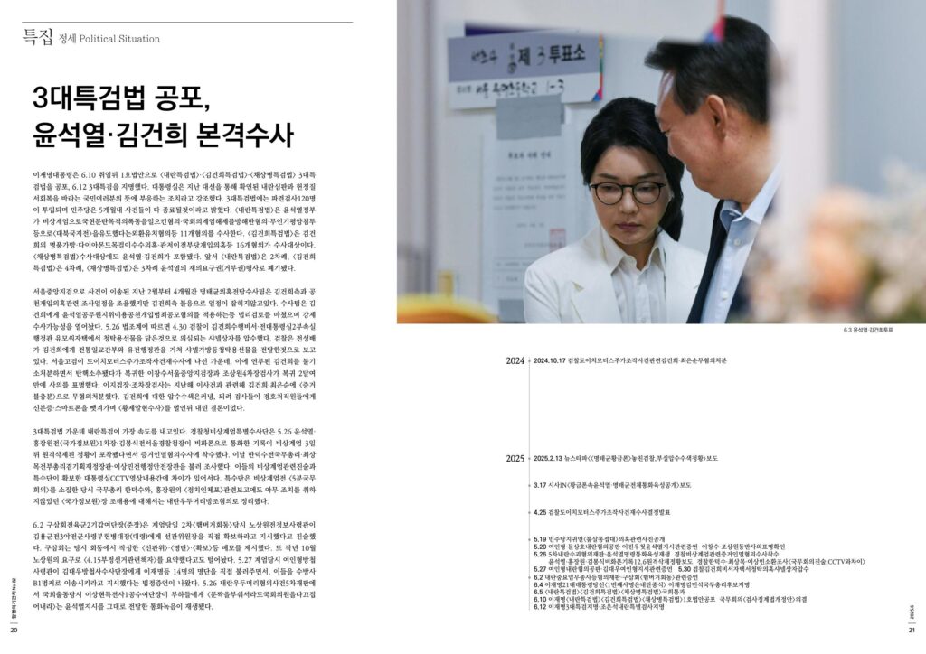 이재명대통령은 6.10 취임뒤 1호법안으로 <내란특검법>·<김건희특검법>·<채상병특검법> 3대특검법을 공포, 6.12 3대특검을 지명했다. 대통령실은 지난 대선을 통해 확인된 내란심판과 헌정질서회복을 바라는 국민여러분의 뜻에 부응하는 조치라고 강조했다. 3대특검법에는 파견검사120명이 투입되며 민주당은 5개월내 사건들이 다 종료될것이라고 밝혔다. <내란특검법>은 윤석열정부가 비상계엄으로국헌문란목적의폭동을일으킨혐의·국회의계엄해제를방해한혐의·무인기평양침투등으로<대북국지전>을유도했다는외환유치혐의등 11개혐의를 수사한다. <김건희특검법>은 김건희의 명품가방·다이아몬드목걸이수수의혹·관저이전부당개입의혹등 16개혐의가 수사대상이다. <채상병특검법>수사대상에도 윤석열·김건희가 포함됐다. 앞서 <내란특검법>은 2차례, <김건희특검법>은 4차례, <채상병특검법>은 3차례 윤석열의 재의요구권(거부권)행사로 폐기됐다.