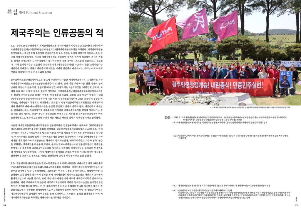 5.17 광주5.18민주광장에서 세계반제플랫포옴·반미투쟁본부·민중민주당(민중당)이 <광주반파쇼반제항쟁정신계승!내란무리청산!미군철거!>5월세계반제동시투쟁을 주최했다. 이적반미투쟁본부상임대표는 조선반도의 불안정과 군사적긴장의 모든 원인을 조선의 책임으로 전가하는것은 미국의 대북적대정책이다, 미국의 대북적대정책을 추종하며 정권의 위기에 직면하면 조선의 위협을 빌미로 전쟁도발과 군사쿠데타까지 불사하는것이 이땅 극우파시스트들의 모습이라고 성토했다. 더해 윤석열괴수는 모든것이 조선때문이며 <자유민주주의>를 수호하기 위한 고심이었다는 괴발언을 토해냈다, 이땅의 내란수괴의 씨앗은 미제의 텃밭에서 나온것이다, 우리는 이제 미제의 텃밭을 갈아엎어야한다고 목소리를 높였다.