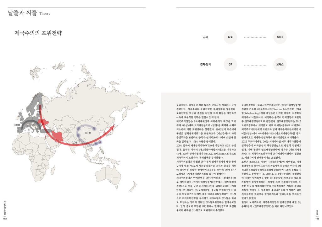 제국주의진영은 반제진영을 <신침략자의축>·<신악의축>으 로 매도하면서 <아시아태평양중시>전략에서 <인도태평양전략>으로 선을 긋고 러시아(소련)를 위협하고있는 <거대 한체스판>전략인 <Ω(오메가)>형, 중국을 위협하고있는 내몽골·신장위구르·티베트·홍콩·대만분리독립전략인 <C>형으로 여러포위전략을 구사하고 이<Ω>형과 <C>형을 하나로 포섭하는 상위의 전략인 <U>형포위전략을 앞세우고있다. 앞서 중국이 포함된 <W>형에서 반제진영으로 포섭된 중국이 배제된 <U>형으로 포위전략이 수정됐다.