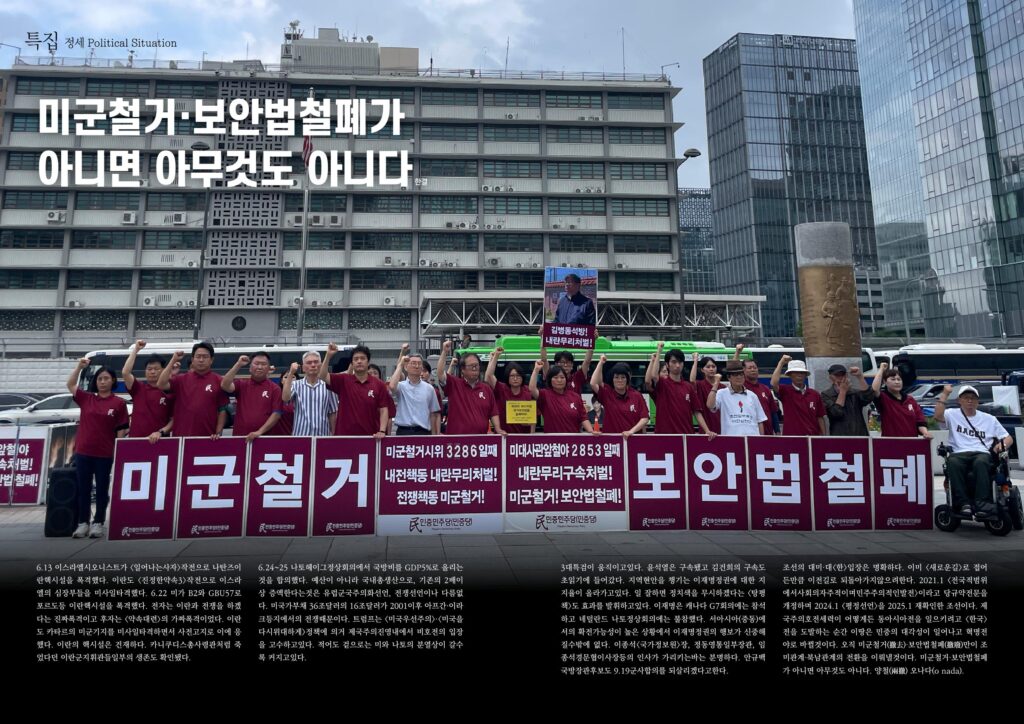 조선의 대미·대<한>입장은 명확하다. 이미 <새로운길>로 접어든만큼 이전길로 되돌아가지않으려한다. 2021.1 <전국적범위에서사회의자주적이며민주주의적인발전>이라고 당규약전문을 개정하며 2024.1 <평정선언>을 2025.1 재확인한 조선이다. 제국주의호전세력이 어떻게든 동아시아전을 일으키려고 <한국>전을 도발하는 순간 이땅은 민중의 대각성이 일어나고 혁명전야로 바뀔것이다. 오직 미군철거(撤去)·보안법철폐(撤廢)만이 조미관계·북남관계의 전환을 이뤄낼것이다. 미군철거·보안법철폐가 아니면 아무것도 아니다. 양철(兩撤) 오나다(o nada).