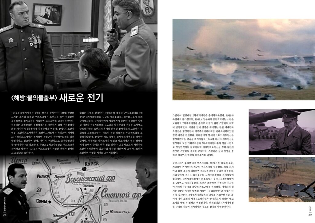 쿠르스크가 뚫리면 바로 모스크바다. 2024.8 미·나토의 조종, 지원하에 키예프신나치군이 쿠르스크를 침공했다. 이를 러시아와 함께 조선이 격퇴하며 2025.3 전투를 승리로 종결했다. 그과정에서 조선은 최고수준의 국제주의정신을 전세계앞에 빛내였다. 2차세계대전에서 파쇼독일은 쿠르스크전투패배이후 단1번도 이기지못했다. 소련은 쾌속으로 서쪽으로 진군하며 파르티잔부대와 결합해 파쇼군대를 격퇴했다. 이영화의 원제는 <해방>이지만 알려진 제목이 <유럽의해방>인 이유가 다른데 있지않다. 2차세계대전승리의 영광을 기회주의적인 영·미가 아닌 소련과 세계진보적인류가 받아안으며 혁명의 대고조기를 열었다. 전쟁은 혁명전야다. 반제진영은 3차세계대전을 승리로 이끌며 세계혁명의 새로운 전기를 마련할것이다.