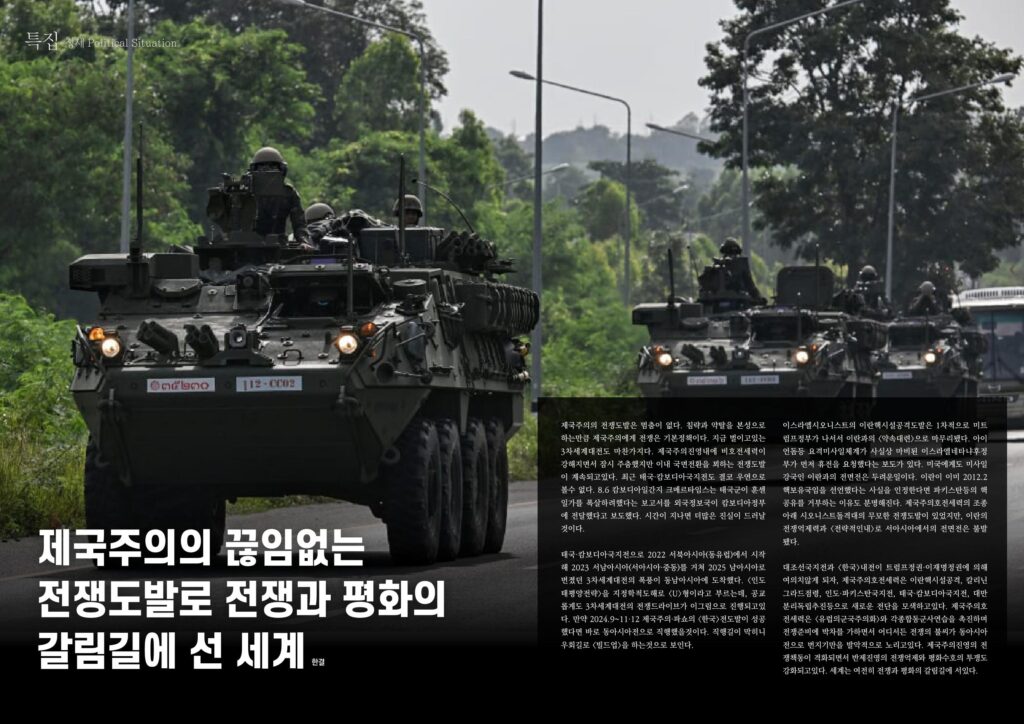 대조선국지전과 <한국>내전이 트럼프정권·이재명정권에 의해 여의치않게 되자, 제국주의호전세력은 이란핵시설공격, 칼리닌그라드점령, 인도·파키스탄국지전, 태국·캄보디아국지전, 대만분리독립추진등으로 새로운 전단을 모색하고있다. 제국주의호전세력은 <유럽의군국주의화>와 각종합동군사연습을 촉진하며 전쟁준비에 박차를 가하면서 어디서든 전쟁의 불씨가 동아시아전으로 번지기만을 발악적으로 노리고있다. 제국주의진영의 전쟁책동이 격화되면서 반제진영의 전쟁억제와 평화수호의 투쟁도 강화되고있다. 세계는 여전히 전쟁과 평화의 갈림길에 서있다.