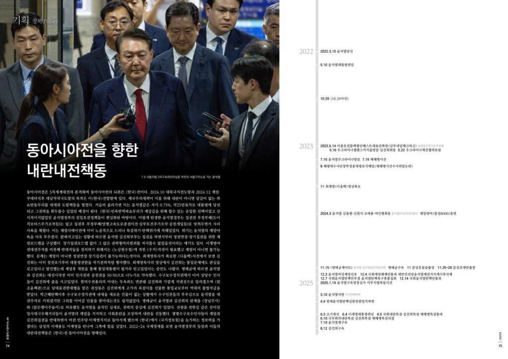 동아시아전은 3차세계대전의 본격화며 동아시아전의 뇌관은 <한국>전이다. 2024.10 대북국지전도발과 2024.12 계엄·쿠데타직후 대남자작극도발의 목적은 이<한국>전발발에 있다. 제국주의세력이 이를 위해 내란이 아니면 살길이 없는 파쇼반동무리를 내세워 도발책동을 벌였다. 거슬러 올라가면 이는 윤석열같은 자가 0.75%, 약25만표차로 대통령에 당선되고 그권력을 휘두를수 있었던 배경이 된다. <한국>민족반역파쇼무리가 제살길을 위해 할수 있는 유일한 선택이었고 상식적이지않았던 윤석열정부의 친일호전정책들이 현실화된 바탕이다. 이렇게 탄생한 윤석열정부는 집권전 부정부패(도이치모터스주가조작등)는 덮고 집권후 부정부패(양평고속도로종점이전·삼부토건주가조작·공천개입등)로 덧씌우면서 사리사욕을 채웠다. 이는 계엄사태이전에 이미 노골적으로 드러나 특검위기·탄핵위기에 처해있었다. 위기는 윤석열의 계엄야욕을 더욱 부추겼다. 밝혀지고있는 정황에 따르면 윤석열·김건희부부는 집권을 하면서부터 정권연장·장기집권을 위한 계엄로드맵을 구상했다. 장기집권로드맵 없이 그 많은 권력형비리범죄를 저지를수 없었을것이라는 얘기도 있다. 이재명야권대권주자를 비롯해 반대자들을 정리하기 위해서는 <노상원수첩>에 적힌 <수거>작전이 필요했고 계엄이 아니면 불가능했다. 문제는 계엄이 아니면 정권연장·장기집권이 불가능하다는것이다. 최재영목사가 폭로한 <디올백>사건에서 보면 김건희는 이미 정권초기부터 대통령권한을 자기권력처럼 행사했다. 최재영목사의 영상에서 김건희는 통일문제에도 관심을 갖고있다고 발언했는데 계엄후 개헌을 통해 통일대통령이 될거라 믿고있었다는 증언도 나왔다. 명태균에 따르면 윤석열과 김건희는 대선시작전 이미 인사권과 공천권을 50:50으로 나누기로 약속했다. 수구보수정치권에서 이미 상당수 인사들이 김건희에 줄을 서고있었다. 한덕수전총리의 아내는 무속과도 연관돼 김건희와 가깝게 지낸것으로 알려졌으며 <원조윤핵관>으로 당대표권한대행을 맡은 권성동은 김건희에게 고가의 목걸이를 선물한 통일교로부터 억대의 불법자금을 받았다. 박근혜탄핵이후 수구보수정치권에 내세울 새로운 인물이 없는 상황에서 수구언론들의 부추김으로 윤석열을 대권주자로 키워냈지만 그뒤를 이어갈 인물을 찾아내는것도 쉽지않았다. 명태균이 윤석열과 김건희의 관계를 <장님무사>와 <앉은뱅이주술사>로 비유했듯 윤석열을 움직인 실세로, 권력의 중심에 김건희가 있었다. 전광훈·전한길 같은 친미친일사대극우패거리들이 윤석열의 계엄을 지지하고 사회혼란을 조장하며 내란을 선동했다. 몇몇수구보수인사들이 계엄과 김건희집권을 반대하면서 야권·민주당·이재명지지로 돌아서게 됐으며 <한국>에서 <국가정보원>을 능가하는 정보력을 가졌다는 삼성의 이재용도 이재명을 만나며 그쪽에 힘을 실었다. 2022~24 국제정세를 보면 윤석열정부의 등장과 이들의 내란내전책동은 <한국>전·동아시아전을 향해있다.