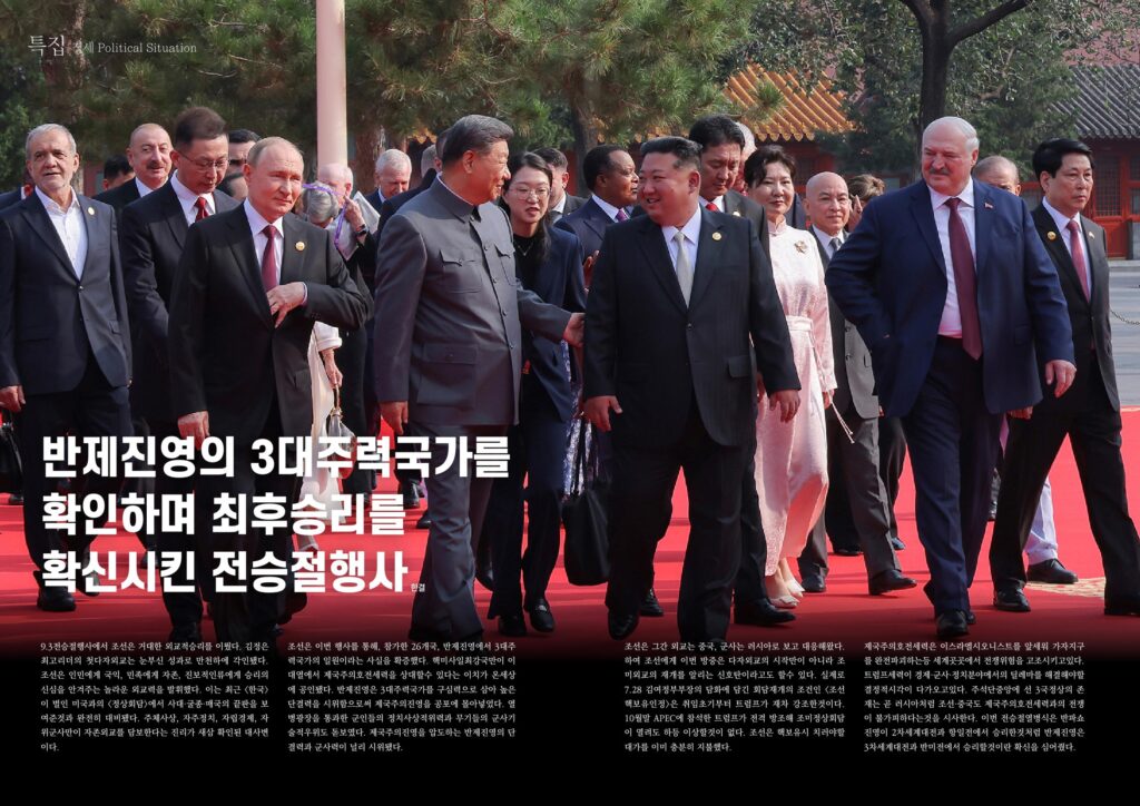 9.3전승절행사에서 조선은 거대한 외교적승리를 이뤘다. 김정은최고리더의 첫다자외교는 눈부신 성과로 만천하에 각인됐다. 조선은 인민에게 국익, 민족에게 자존, 진보적인류에게 승리의신심을 안겨주는 놀라운 외교력을 발휘했다. 이는 최근 <한국>이 벌인 미국과의 <정상회담>에서 사대·굴종·매국의 끝판을 보여준것과 완전히 대비됐다. 주체사상, 자주정치, 자립경제, 자위군사만이 자존외교를 담보한다는 진리가 새삼 확인된 대사변이다.