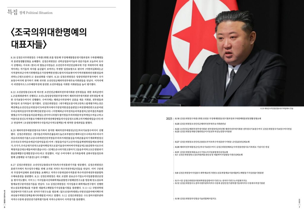 8.18 김정은국무위원장은 구축함<최현>호를 방문해 무장체계통합운영시험과정과 구축함해병들의 훈련및생활정형을 요해했다. 김정은위원장은 선박공업분야기술자·전문가들과 오늘부터 또다시 감행되는 미국과 <한국>의 합동군사연습은 조선민주주의인민공화국에 가장 적대적이며 대결적이려는 자기들의 의사를 숨김없이 보여주는 뚜렷한 입장표명으로 된다며 <미한의심화되는군사적결탁과군사력시위행위들은가장명백한전쟁도발의지의표현이며지역의평화와안전환경을파괴하는근원으로된다>고 중요담화를 나눴다. 8.20 김정은위원장은 당중앙위본부청사에서 국가표창수여식에 참가하기 위해 귀국한 조선인민군해외작전부대주요지휘관들을 만났다. 이자리에서 러연방쿠르스크주해방작전에 참전한 조선부대들을 지휘한 지휘관들을 높이 평가했다.