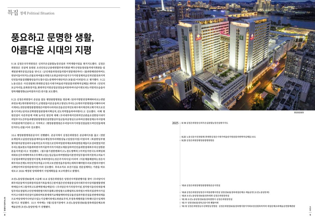10.6 평양종합병원준공식이 진행됐다. 준공식에서 김정은위원장은 준공테이프를 끊고 <정말로제일하고싶었던일들중에마음속제일첫자리에항상놓고있었던사업>이었다며 <복잡한일부몇몇사람의공명심과무규율적인조직사업으로인하여일련의애로와복잡한문제들이조성되였었지만우리는필요한조치를취하면서까지끝까지자기의본도에충실하여인민을위한절대복무의신성한본분을지켜냈>다고 연설했다. <필수불가결한변화이고노정도명백히그어져있지만극도의책임회피와보신주의에빠져속수무책하고있는일군들로하여병원들이본연의임무를다하지못하고의료기구공업과제약공업발전이정체,후퇴하였다는것은주지의사실>이라며 <이문제를해결하는것은사회주의보건제도의인민적성격을고수하고보건발전을추동하는데복무해야할우리보건법의사명이고책임이며국정의중대사안>이라 강조했다. 후속조치로 보건시설을 전문설계하는 기관을 따로 내오고 2026 예정된 당대회에서 사업계획들을 보고하겠다고 밝혔다.