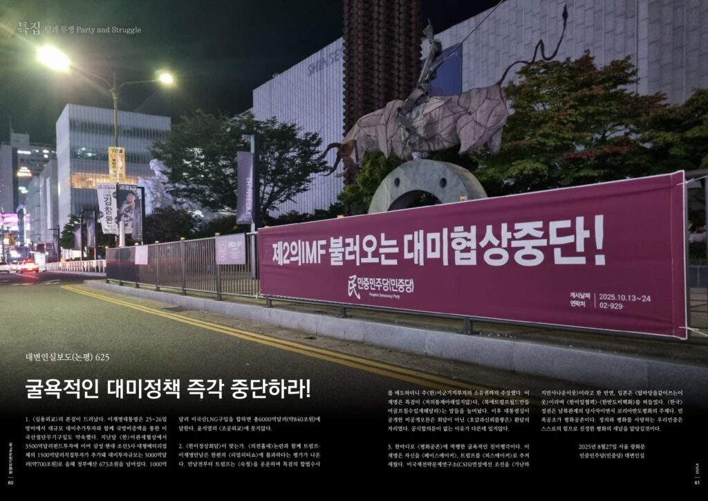 3. 한마디로 <평화공존>에 역행한 굴욕적인 친미행각이다. 이재명은 자신을 <페이스메이커>, 트럼프를 <피스메이커>로 추켜세웠다. 미국제전략문제연구소(CSIS)연설에선 조선을 <가난하지만사나운이웃>이라고 한 반면, 일본은 <앞마당을같이쓰는이웃>이라며 <한미일협력>·<한반도비핵화>를 떠들었다. <한국>정권은 남북관계의 당사자이면서 코리아반도평화의 주체다. 민족공조가 평화공존이다. 정의와 평화를 사랑하는 우리민중은 스스로의 힘으로 진정한 평화의 새날을 앞당길것이다.