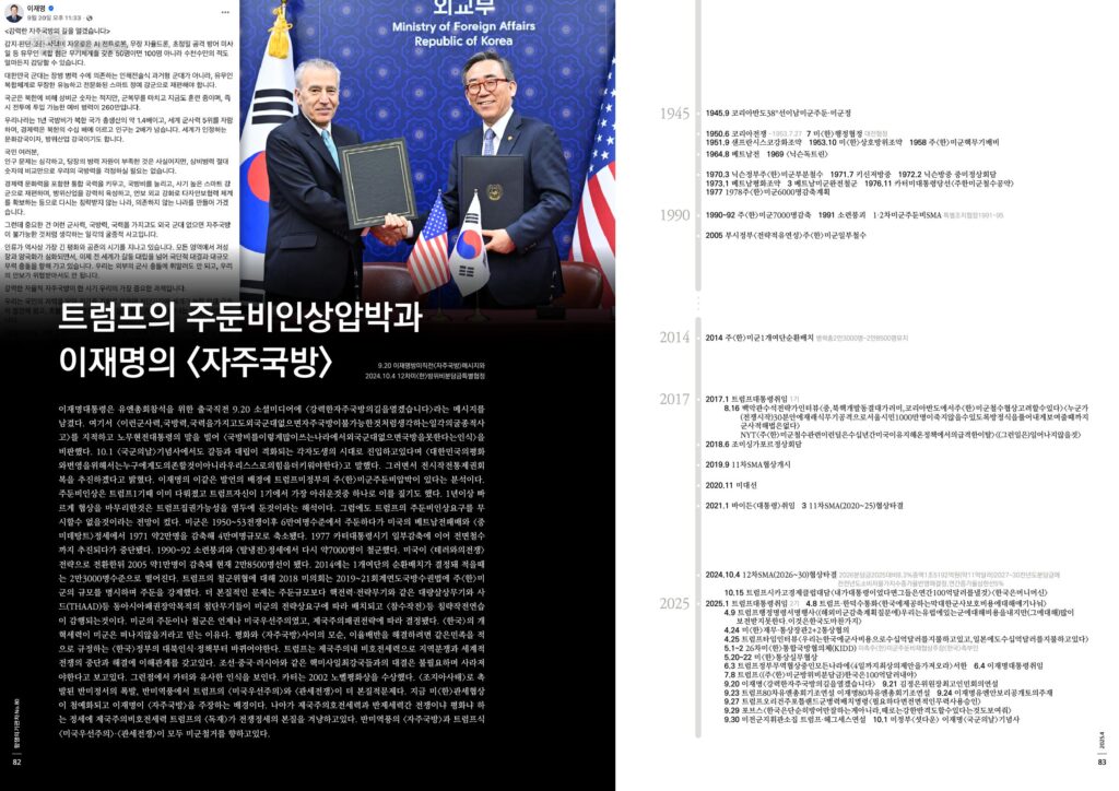 이재명대통령은 유엔총회참석을 위한 출국직전 9.20 소셜미디어에 <강력한자주국방의길을열겠습니다>라는 메시지를 남겼다. 여기서 <이런군사력,국방력,국력을가지고도외국군대없으면자주국방이불가능한것처럼생각하는일각의굴종적사고>를 지적하고 노무현전대통령의 말을 빌어 <국방비를이렇게많이쓰는나라에서외국군대없으면국방을못한다는인식>을 비판했다. 10.1 <국군의날>기념사에서도 갈등과 대립이 격화되는 각자도생의 시대로 진입하고있다며 <대한민국의평화와번영을위해서는누구에게도의존할것이아니라우리스스로의힘을더키워야한다>고 말했다. 그러면서 전시작전통제권회복을 추진하겠다고 밝혔다. 이재명의 이같은 발언의 배경에 트럼프미정부의 주<한>미군주둔비압박이 있다는 분석이다. 주둔비인상은 트럼프1기때 이미 다뤄졌고 트럼프자신이 1기에서 가장 아쉬운것중 하나로 이를 짚기도 했다. 1년이상 빠르게 협상을 마무리한것은 트럼프집권가능성을 염두에 둔것이라는 해석이다. 그럼에도 트럼프의 주둔비인상요구를 무시할수 없을것이라는 전망이 컸다. 미군은 1950~53전쟁이후 6만여명수준에서 주둔하다가 미국의 베트남전패배와 <중미데탕트>정세에서 1971 약2만명을 감축해 4만여명규모로 축소됐다. 1977 카터대통령시기 일부감축에 이어 전면철수까지 추진되다가 중단됐다. 1990~92 소련붕괴와 <탈냉전>정세에서 다시 약7000명이 철군했다. 미국이 <테러와의전쟁>전략으로 전환한뒤 2005 약1만명이 감축돼 현재 2만8500명선이 됐다. 2014에는 1개여단의 순환배치가 결정돼 적을때는 2만3000명수준으로 떨어진다. 트럼프의 철군위협에 대해 2018 미의회는 2019~21회계연도국방수권법에 주<한>미군의 규모를 명시하며 주둔을 강제했다. 더 본질적인 문제는 주둔규모보다 핵전력·전략무기와 같은 대량살상무기와 사드(THAAD)등 동아시아패권장악목적의 첨단무기들이 미군의 전략상요구에 따라 배치되고 <참수작전>등 침략작전연습이 감행되는것이다. 미군의 주둔이나 철군은 언제나 미국우선주의였고, 제국주의패권전략에 따라 결정됐다. <한국>의 개혁세력이 미군은 떠나지않을거라고 믿는 이유다. 평화와 <자주국방>사이의 모순, 이율배반을 해결하려면 같은민족을 적으로 규정하는 <한국>정부의 대북인식·정책부터 바뀌어야한다. 트럼프는 제국주의내 비호전세력으로 지역분쟁과 세계적전쟁의 중단과 해결에 이해관계를 갖고있다. 조선·중국·러시아와 같은 핵미사일최강국들과의 대결은 불필요하며 사라져야한다고 보고있다. 그런점에서 카터와 유사한 인식을 보인다. 카터는 2002 노벨평화상을 수상했다. <조지아사태>로 촉발된 반미정서의 폭발, 반미역풍에서 트럼프의 <미국우선주의>와 <관세전쟁>이 더 본질적문제다. 지금 미<한>관세협상이 첨예화되고 이재명이 <자주국방>을 주장하는 배경이다. 나아가 제국주의호전세력과 반제세력간 전쟁이냐 평화냐 하는 정세에 제국주의비호전세력 트럼프의 <독재>가 전쟁정세의 본질을 겨냥하고있다. 반미역풍의 <자주국방>과 트럼프식<미국우선주의>·<관세전쟁>이 모두 미군철거를 향하고있다.