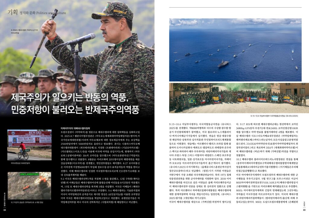 9.15~10.6 미남부사령부는 다국적합동군사연습 <유니타스2025>를 전개했다. 약8000여병력과 다수의 수상함·잠수함·항공기·무인함대체계가 참여했고, 미국 플로리다·노스캐롤라이나·버지니아해군기지등에서 실시했다. 연습은 방공·대잠수함전·해상차단·상륙작전·실사격훈련·무인및하이브리드체계통합등으로 이뤄졌다. 연습에는 아르헨티나·벨리즈·브라질·칠레·콜롬비아·도미니카공화국·에콰도르·엘살바도르·과테말라·온두라스·멕시코·파라과이·페루·우루과이등 라틴아메리카국가들과 캐나다·프랑스·독일·그리스·이탈리아·네덜란드·스페인·포르투갈등 나토회원국들, 일본·싱가포르등 아시아친미국가들, 자메이카·모로코등 아프리카친미국가들까지 총27개국이 참가했다. <유니타스2025>수석기획자는 <올해유니타스훈련은역사상가장큰규모중하나>라고 언급했다. <냉전>시기 시작된 이연습은 서반구에서 가장 오래된 다국적해상연습이다. 특히 1973 칠레민중정권전복을 위한 군사쿠데타를 지원한바 있다. 2018 이미 베네수엘라를 타깃으로 삼은 이연습은 올해 카리브해주둔미군이 베네수엘라정부·민중을 상대로 한 심리전의 일환으로 감행됐다. 특히 아르헨티나 하비에르밀레이대통령은 베네수엘라에 대한 잠재적침략에 자국을 개입시킨다는 입장인데, <유니타스2025>참가를 그첫단계로 여기고있다.
