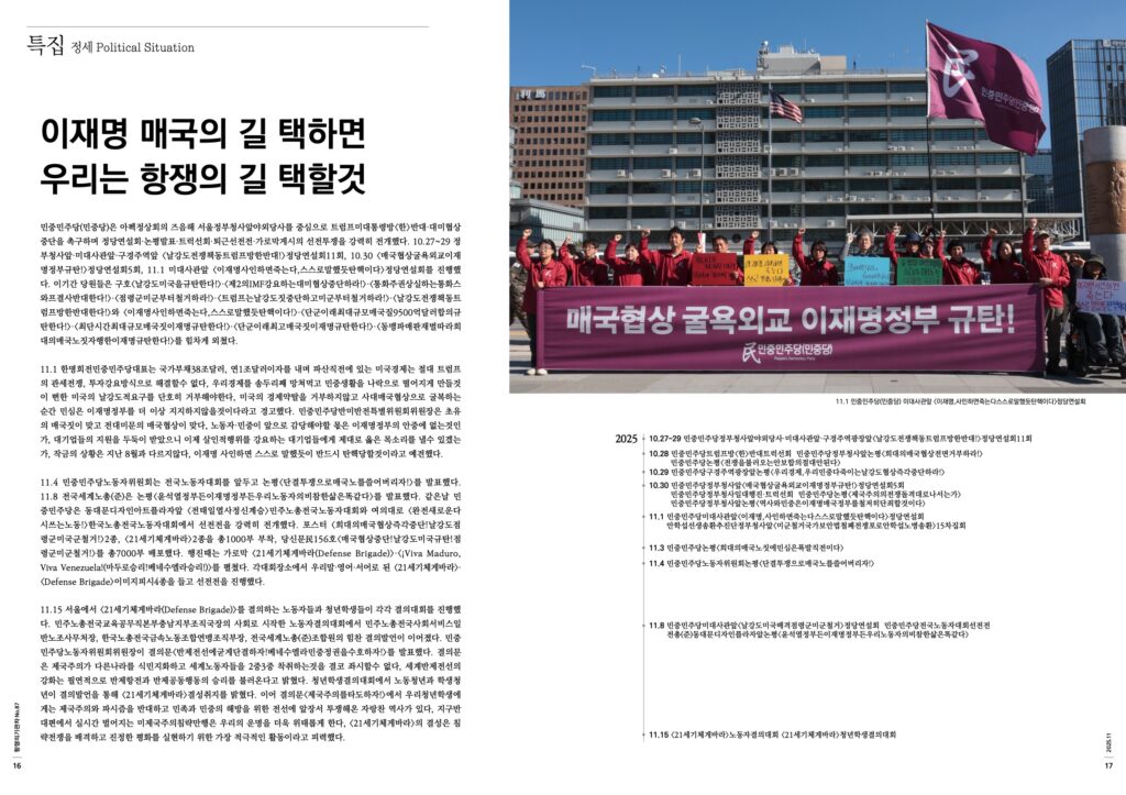 11.4 민중민주당노동자위원회는 전국노동자대회를 앞두고 논평<단결투쟁으로매국노를쓸어버리자!>를 발표했다. 11.8 전국세계노총(준)은 논평<윤석열정부든이재명정부든우리노동자의비참한삶은똑같다>를 발표했다. 같은날 민중민주당은 동대문디자인아트플라자앞 <전태일열사정신계승>민주노총전국노동자대회와 여의대로 <완전새로운다시쓰는노동!>한국노총전국노동자대회에서 선전전을 강력히 전개했다. 포스터 <희대의매국협상즉각중단!날강도점령군미국군철거!>2종, <21세기체게바라>2종을 총1000부 부착, 당신문民156호<매국협상중단!날강도미국규탄!점령군미군철거!>를 총7000부 배포했다. 행진때는 가로막 <21세기체게바라(Defense Brigade)>·<¡Viva Maduro, Viva Venezuela!(마두로승리!베네수엘라승리!)>를 펼쳤다. 각대회장소에서 우리말·영어·서어로 된 <21세기체게바라>·<Defense Brigade>이미지피시4종을 들고 선전전을 진행했다.