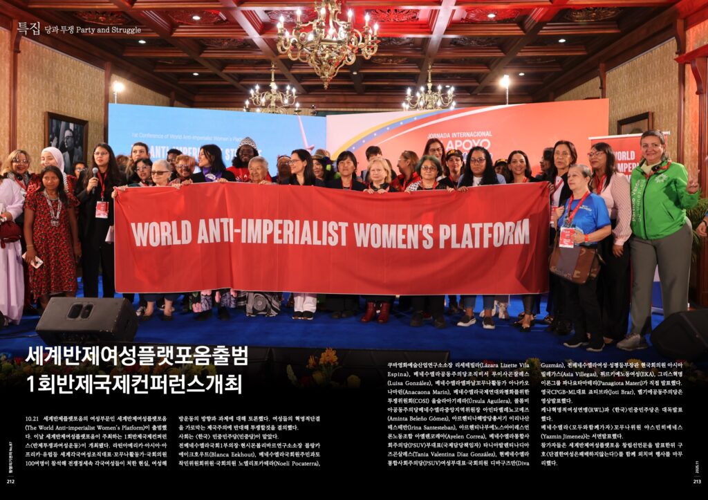 10.21 세계반제플랫포옴의 여성부문인 세계반제여성플랫포옴(The World Anti-imperialist Women’s Platform)이 출범했다. 이날 세계반제여성플랫포옴이 주최하는 1회반제국제컨퍼런스<반제투쟁과여성운동>이 개최됐다. 라틴아메리카·아시아·아프리카·유럽등 세계각국여성조직대표·꼬무나활동가·국회의원100여명이 참석해 전쟁정세속 각국여성들이 처한 현실, 여성해방운동의 방향과 과제에 대해 토론했다. 여성들의 혁명적단결을 가로막는 제국주의에 반대해 투쟁할것을 결의했다.