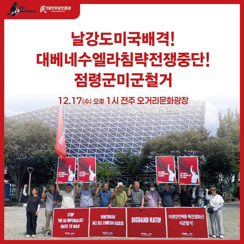 Sign in Welcome! Log into your account your username your password Forgot your password? Get help 개인정보처리방침 Password recovery Recover your password your email A password will be e-mailed to you. Home소식 소식 12.17수 13시 전주 오거리문화광장 〈날강도미국배격! 대베네수엘라침략전쟁중단! 점령군미군철거!〉정당연설회 2025년 12월 15일 Previous article[당·단체공동성명] 날강도 침략자 미제국주의를 끝장내자! - Advertisement - 최신글 [당·단체공동성명] 날강도 침략자 미제국주의를 끝장내자! 2025년 12월 13일 [대변인실보도(성명) 645] 미제국주의의 베네수엘라유조선불법나포를 강력히 규탄한다! 2025년 12월 12일 〈미제국주의베네수엘라유조선나포규탄!〉 21세기체게바라·민중민주당 미대사관앞정당연설회 2025년 12월 12일 12.13토 14시 미대사관앞 〈날강도 전쟁책동 제국주의미국배격! 반제자주실현!〉집회 2025년 12월 11일 [학생위원회보도(논평) 9] 청년학생의 미래를 파괴하는 제국주의 타도하자! 2025년 12월 11일