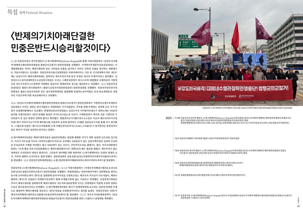 21세기체게바라단원은 베네수엘라민중은 800만민병대로 결집해 평화를 지키기 위한 실천에 모든것을 걸고있다, 미국이 마두로를 아무리 <마약카르텔우두머리>로 조작해도 500만호가 넘는 공동주택건설의 성과와 무상의료·무상교육의 사회를 파괴할수 없고 5000개가 넘는 꼬무나, 주민자치조직을 없앨수는 없다, 마두로대통령이 말하는 <주권·평등·자유가보장된평화>는 베네수엘라뿐아니라 <대한민국>에도 필요한 평화다, 제국주의가 없는 새세상은 우리민중의 내일이 될것이다, 그민중의 새미래를 위한 방위여단 21세기체게바라는 단결과 연대의 조직, 자주와 평화의 조직이라고 힘줘 말했다. 정당연설회후 공동성명<날강도며침략자인미제국주의를타도하자!>를 발표했다. 12.9 민중민주당학생위원회는 논평<청년학생의미래를파괴하는제국주의타도하자!>를 발표했다.