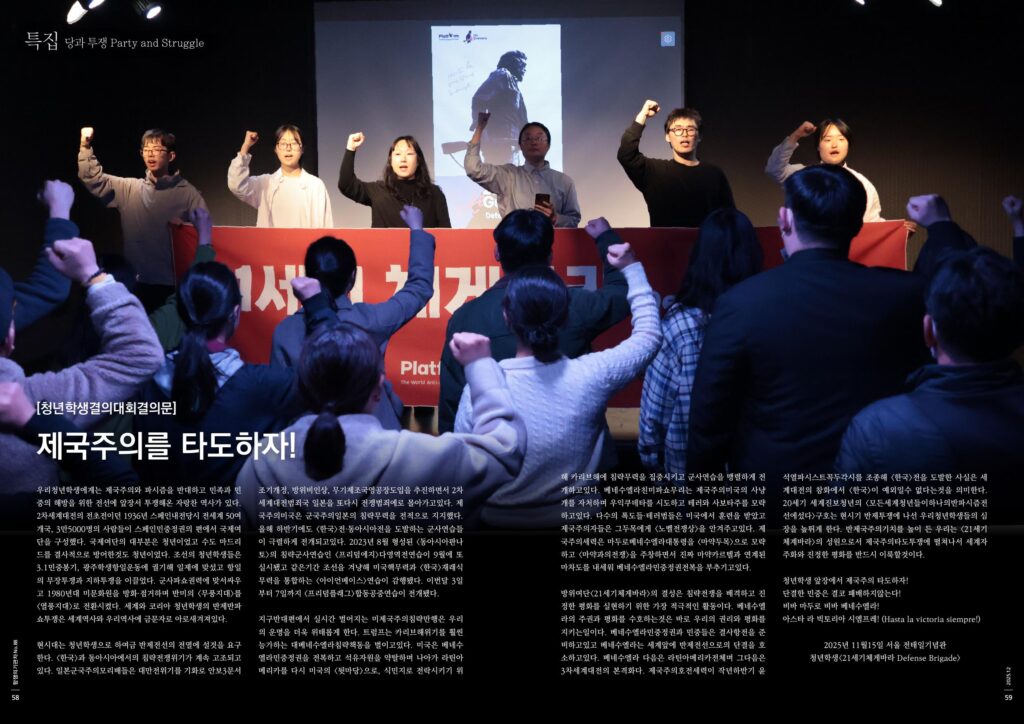 우리청년학생에게는 제국주의와 파시즘을 반대하고 민족과 민중의 해방을 위한 전선에 앞장서 투쟁해온 자랑찬 역사가 있다. 2차세계대전의 전초전이던 1936년 스페인내전당시 전세계 50여개국, 3만5000명의 사람들이 스페인민중정권의 편에서 국제여단을 구성했다. 국제여단의 대부분은 청년이었고 수도 마드리드를 결사적으로 방어한것도 청년이었다. 조선의 청년학생들은 3.1민중봉기, 광주학생항일운동에 궐기해 일제에 맞섰고 항일의 무장투쟁과 지하투쟁을 이끌었다. 군사파쇼권력에 맞서싸우고 1980년대 미문화원을 방화·점거하며 반미의 <무풍지대>를 <열풍지대>로 전환시켰다. 세계와 코리아 청년학생의 반제반파쇼투쟁은 세계역사와 우리역사에 금문자로 아로새겨져있다.