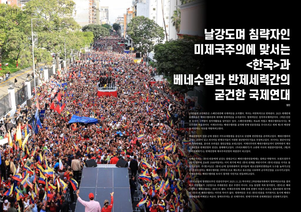 <한국>민중의 항쟁참모부인 민중민주당이 2025.11.23 역사적인 2차당대표자회에서 방위여단조직을 결의하고 전당대표가 그단장으로 추대된것은 결코 우연이 아니다. 오늘 동일한 적과 맞서면서, <한국>은 베네수엘라고 베네수엘라는 <한국>이 됐다. 미제국주의에 의해 언제 전쟁이 터질지 모르는 일촉즉발의 위기에서 <한국>과 베네수엘라는 아무런 차이가 없다. 방위여단은 우선 <한국>민중을 지키면서도 동시에 베네수엘라민중과 어깨겯고 싸운다. 참애국주의는 곧 국제주의다. 반제기치아래 전세계민중은 단결해가고있다.