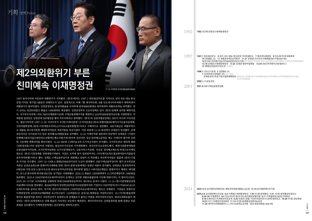 1997 동아시아에 미증유의 외환위기가 시작됐다. <한국>에서는 1997.1 한보철강부도를 시작으로 삼미·진로·대농·한신공영·기아등 대기업그룹들의 연쇄부도가 났다. 결정적으로 이해 7월 태국바트화, 8월 인도네시아루피화가 폭락하면서 외환위기가 불어닥쳤다. 김영삼정부는 원·달러환율을 무리하게 달러당800원대로 방어하려다 외환보유액을 허비했다. 당시 금리는 연20%대였고 환율은 1900원대로 폭등했다. 김영삼정부의 고금리정책은 당시 <한국>경제에 심각한 패착이었다. 국가부도직전에 1차로 IMF(국제통화기금)와 구제금융양해각서를 체결하고 233억5000만달러규모를 지원받았다. 미대통령 클린턴은 김영삼에 IMF협상을 빨리 마무리하라고 압박했다. <한국>의 실질적협상상대는 IMF가 아니라 미국이었다. 협상시작직전 1997.11.26 미국무부가 주<한>미대사관에 <수석자문관은<한국>과협의될IMF패키지가금융부문개혁,긴축적통화정책,<한국>시장개방조치라는3가지요소를포함할것>이라고 구체적으로 전달했다. IMF지원금은 외환부족으로 대출을 회수하지못한 해외투자자들의 자본이탈을 촉진시켰다. 이런 와중에 12.18 대선에서 김대중이 당선됐다. 김대중당선인은 선거운동기간 임금·정리해고6개월동결을 공약했다. 12.22 미재무차관 립턴과의 만남에서 김대중은 <기업이망해해고를하지않으면안되는상황에는해고가불가피>하다며 당선직후 임금·정리해고공약을 깨고 미재무부·월가에 강력한 시장개방·개혁의지를 확인시켰다. 12.24 IMF와 13개주요국의 조기자금지원이 추가됐다. 국가부도만은 면하게 해줘 <성탄절선물>이라 일컬어진 이합의는 콜금리추가인상과 이자제한폐지, 외국인주식소유한도폐지, 채권시장완전개방과 금융상품투자자유화, 조기무역자유화등 조기시장개방조치, 금융서비스자유화, 사실상 정리해고제도입·파견근로자제입법으로 <한국>시장경제를 전면개방시켜놨다. 이같은 조치에 당시 클린턴마저도 <미국에서조차도결코받아들이지않을자본주의적관행>이라고 했다. 실제로 구제금융투입이후 대량해고·실업이 더 폭증했고 외국투자자들은 헐값에 <한국>기업과 주식을 인수했다. 1997.12~1998.4 월평균3000건이상의 도산이 발생했다. IMF구제금융투입이후 월가·초국적금융자본은 금전손실최소화·경제이익극대화된 반면 <한국>경제·민중에게는 엄청난 비용이 전가됐다. 김대중은 당선되자마자 4대(금융·기업·공공·노동)구조조정·대규모공적자금투입을 할수밖에 없었고 5대시중은행들은 합병되거나 해외로 매각됐다. 포스코·한국전력·한국통신(KT)등 공기업은 사영화됐다. 2024.12 환율은 1300원대에서 12.3비상계엄이후 1480원을 돌파했다. 2025.8 3500억달러규모대미투자안이 공개되고 심각한 외환유출불안에 기인해 원화가치는 더 떨어지고있다. 2025.10~11기준 1470원대를 상회하며 연내1500원대상승까지도 내다보는 분석이 나왔다. 11.14 <한>미관세협상설명자료(팩트시트)를 발표했다. 총2000억달러·연상한200억달러10년분할투자와 기업주도1500억달러<마스가(MASGA)>프로젝트투자를 골자로 한다. 여기에 <한국>대기업들의 1500억달러규모대미투자는 별도로 진행된다. 기업들은 한편으로 이재명정부에 금산분리규제완화를 요구하고있다. <AI버블론>은 삼성·SK·현대등을 겨냥하고있다. 10.1미<한>환율정책합의로 환율방어를 못하고 국민연금까지 동원하는데 경제출로가 없다는 비판을 피하지못하고있다. 대규모외화유출이 예상되는 <한국>경제정책으로 인해 환율의 지속적인 상승세가 예견된다. 제국주의미국은 김대중정부를 통해 엄청난 민중희생을 강요했듯이 이재명정권에게도 같은압박을 반복하고있다.