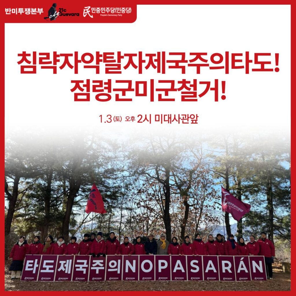 Sign in Welcome! Log into your account your username your password Forgot your password? Get help 개인정보처리방침 Password recovery Recover your password your email A password will be e-mailed to you. Home소식 소식 1.3토 14시 미대사관앞 〈침략자약탈자제국주의타도! 점령군미군철거!〉정당연설회 2026년 1월 2일 Previous article〈타도제국주의!〉 21세기체게바라(Defense Brigade)·민중민주당(민중당) 신년결의대회 - Advertisement - 최신글 〈타도제국주의!〉 21세기체게바라(Defense Brigade)·민중민주당(민중당) 신년결의대회 2026년 1월 1일 〈국가보안법폐지를 부정하는자들이야말로 국가적오물〉 민중민주당인권위 광화문정부청사앞 석권호석방투쟁 연대 2026년 1월 1일 2025 세계반제플랫포옴 10대뉴스 2026년 1월 1일 [대변인실보도(논평) 646] 점령군 약탈자 제국주의를 타도하자! 2026년 1월 1일 [결의문] 제국주의를 타도하자! 2025년 12월 31일