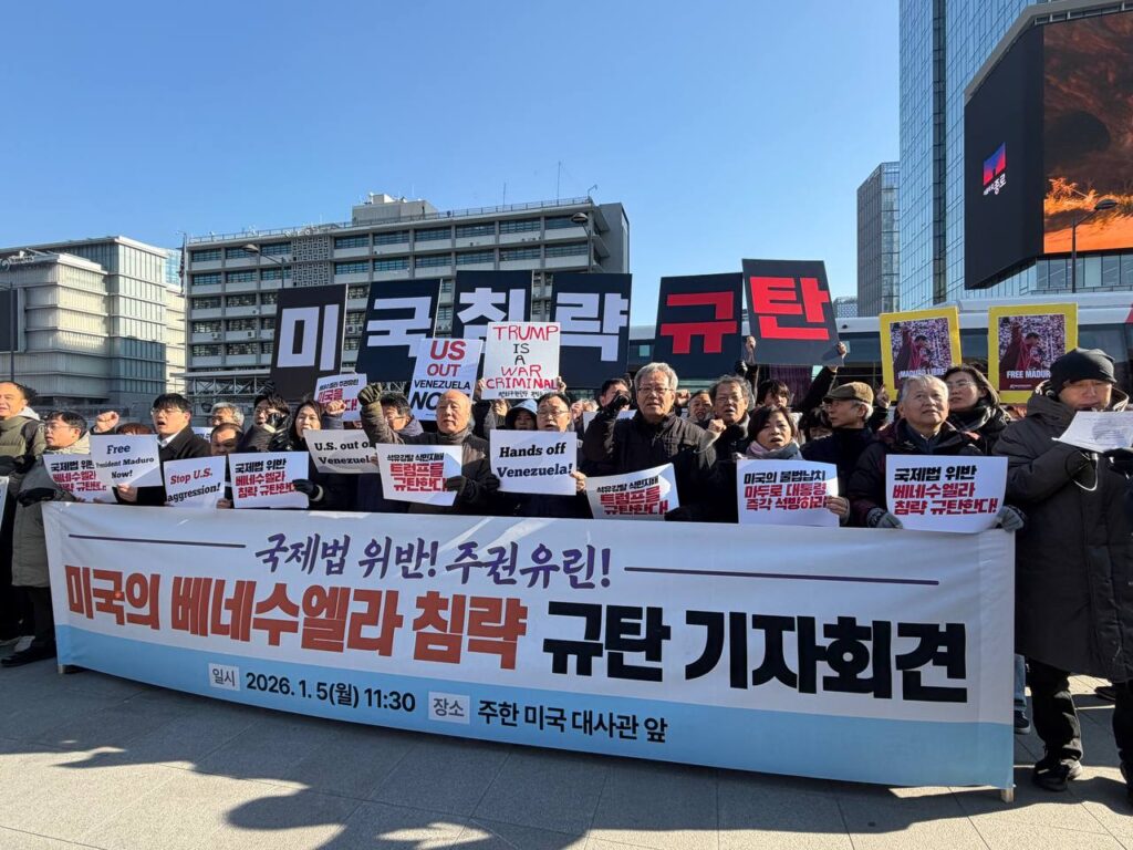 트럼프위협저지공동행동(준)을 비롯 각계 267개 시민사회단체는 <국제법위반 베네수엘라침공 규탄한다!>, <베네수엘라 주권유린 미국을 규탄한다!>, <석유강탈 식민지배 트럼프 규탄한다!>, <불법납치 마두로대통령 즉각 석방하라!>는 구호를 외쳤다.
