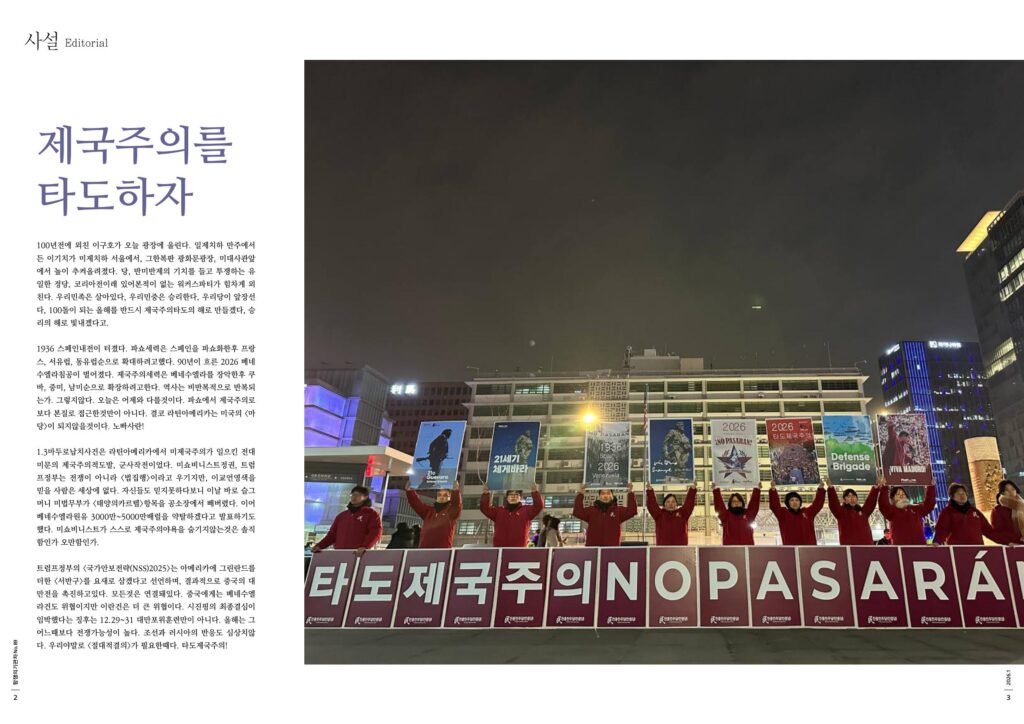 1936 스페인내전이 터졌다. 파쇼세력은 스페인을 파쇼화한후 프랑스, 서유럽, 동유럽순으로 확대하려고했다. 90년이 흐른 2026 베네수엘라침공이 벌어졌다. 제국주의세력은 베네수엘라를 장악한후 쿠바, 중미, 남미순으로 확장하려고한다. 역사는 비반복적으로 반복되는가. 그렇지않다. 오늘은 어제와 다를것이다. 파쇼에서 제국주의로 보다 본질로 접근한것만이 아니다. 결코 라틴아메리카는 미국의 <마당>이 되지않을것이다. 노빠사란!