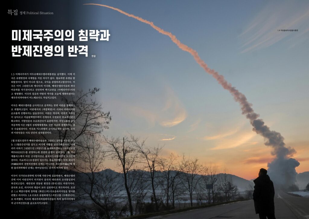1.3 미제국주의가 마두로베네수엘라대통령을 납치했다. 이제 미국은 유엔헌장과 국제법을 지킬 의사가 없다. 필요하면 유엔을 탈퇴할것이다. 말이 아니라 힘으로, 국익을 관철하려고할것이다. 미국은 이미 그린란드와 캐나다의 미국화, 베네수엘라석유와 파나마운하를 자기것이라고 선언하며 멕시코만을 <아메리카만>이라고 명명했다. 미국의 침공과 약탈의 역사를 오늘에 재현하겠다는 제국주의적야욕이 어느때보다도 차넘치고있다.