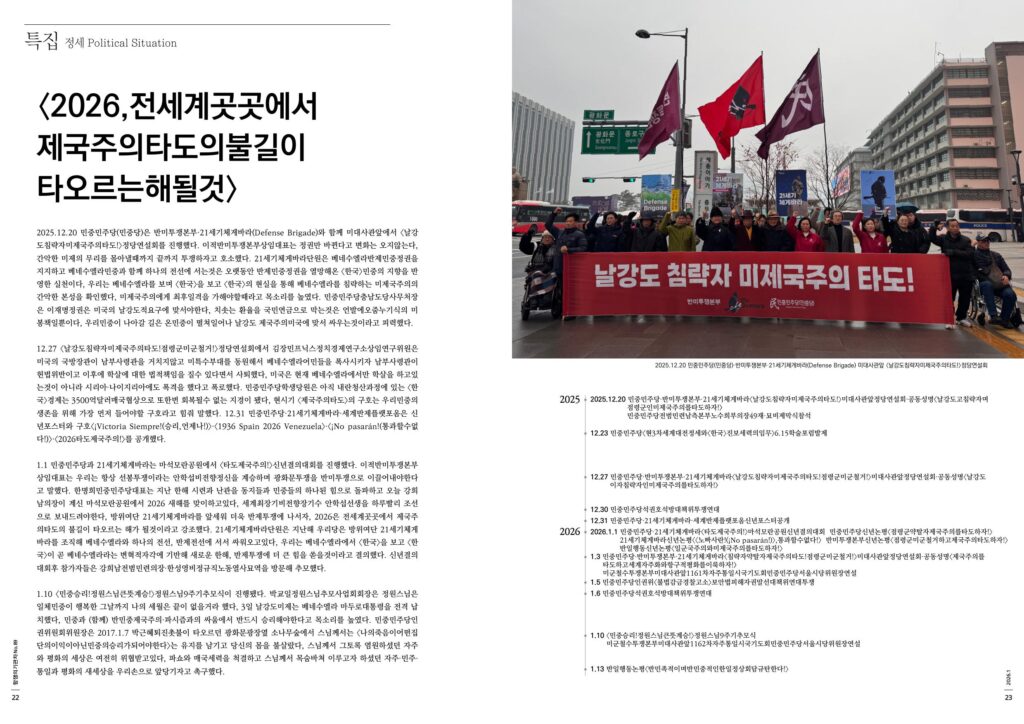 12.27 <날강도침략자미제국주의타도!점령군미군철거!>정당연설회에서 김장민프닉스정치경제연구소상임연구위원은 미국의 국방장관이 남부사령관을 거치지않고 미특수부대를 동원해서 베네수엘라어민들을 폭사시키자 남부사령관이 헌법위반이고 이후에 학살에 대한 법적책임을 질수 있다면서 사퇴했다, 미국은 현재 베네수엘라에서만 학살을 하고있는것이 아니라 시리아·나이지리아에도 폭격을 했다고 폭로했다. 민중민주당학생당원은 아직 내란청산과정에 있는 <한국>경제는 3500억달러매국협상으로 또한번 회복될수 없는 지경이 됐다, 현시기 <제국주의타도>의 구호는 우리민중의 생존을 위해 가장 먼저 들어야할 구호라고 힘줘 말했다. 12.31 민중민주당·21세기체게바라·세계반제플랫포옴은 신년포스터와 구호<¡Victoria Siempre!(승리,언제나!)>·<1936 Spain 2026 Venezuela>·<¡No pasarán!(통과할수없다!)>·<2026타도제국주의!>를 공개했다.