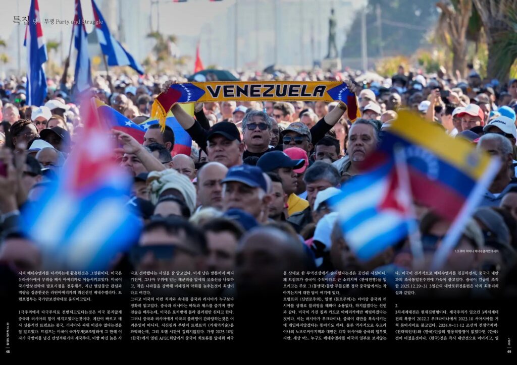 오늘날 3차세계대전의 대표적인 전장은 우크라이나의 동유럽과 팔레스타인등 서아시아로 2곳이다. 여기에 대만과 <한국>이 포함되는 동아시아가 임박한곳이다. 이런 의미에서 2대전장, 3대전장이라고 부른다. 3차세계대전의 주전장과 관련해서 전략적으로 중요한 내용은 미제국주의가 더이상 2개전장에서 동시에 승리할수 없다는것이다. 2개는커녕 1개의 전장에서도 승리하지못했다는것이 우크라이나전과 서아시아전이 입증하는 진실이다. 사실 2차세계대전이후 미국은 말만 거창했지 단1번도 2개전장에서 동시에 승리한적이 없다. 그런 의미에서 트럼프정부의 국가안보전략이 <인도태평양전략>에서 신먼로주의를 선택하며 유라시아에서 아메리카로 방향을 튼것은 당연하다. 이는 이제 온세상이 그불가능성을 다 알게 된 <2개전장동시승리전략>과 같은 블러핑을 더이상 하지않겠다는 선언이다. 미국의 인근지역, 아직은 중국과 러시아가 핵항모단을 파견할수 없는 지역, 특히 카리브해와 라틴아메리카 지역만큼은 확실히 장악하겠다는 의지의 표현, <절대적결의>다.
