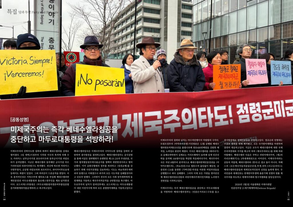 미제국주의는 즉각 베네수엘라침공을 중단하고 마두로대통령을 석방하라! 베네수엘라정부는 <민중은 거리로!>구호를 들고 결사항전에로 전체민중들을 추동하고 있다. 정규군과 민병대는 주권과 평화를 위해 배치됐고, 모든 국가방어계획을 마련하며 결연히 대응하고 있다. 지금은 모두가 베네수엘라에 대한 국제주의적 연대와 지지를 확고히 하며 <제국주의타도>를 위해 싸워야 할 때다. 베네수엘라 다음은 쿠바고 라틴아메리카며, <제2의카리브해위기>는 3차세계대전으로 이어진다. 미제국주의라는 공동의 적앞에, 베네수엘라와 <한국>은 결코 둘이 아니다. 차베스의 <모든 애국자들의 응답은 단결, 투쟁, 전투 그리고 승리다>는 베네수엘라민중들과 세계진보적 인류의 심장을 높뛰게 한다. 우리민중과 세계인류는 반제반미투쟁에 총분기해 전쟁의 원흉 제국주의를 타도하고 세계자주화와 항구적 평화를 앞당길 것이다.