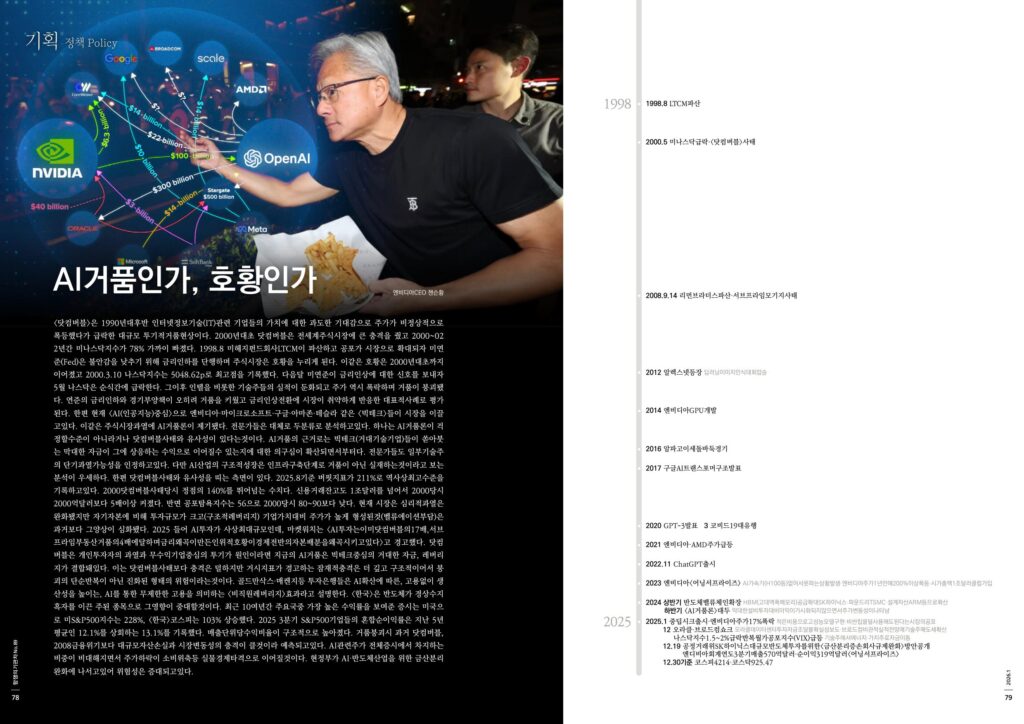 <닷컴버블>은 1990년대후반 인터넷정보기술(IT)관련 기업들의 가치에 대한 과도한 기대감으로 주가가 비정상적으로 폭등했다가 급락한 대규모 투기적거품현상이다. 2000년대초 닷컴버블은 전세계주식시장에 큰 충격을 줬고 2000~02 2년간 미나스닥지수가 78% 가까이 빠졌다. 1998.8 미헤지펀드회사LTCM이 파산하고 공포가 시장으로 확대되자 미연준(Fed)은 불안감을 낮추기 위해 금리인하를 단행하며 주식시장은 호황을 누리게 된다. 이같은 호황은 2000년대초까지 이어졌고 2000.3.10 나스닥지수는 5048.62p로 최고점을 기록했다. 다음달 미연준이 금리인상에 대한 신호를 보내자 5월 나스닥은 순식간에 급락한다. 그이후 인텔을 비롯한 기술주들의 실적이 둔화되고 주가 역시 폭락하며 거품이 붕괴됐다. 연준의 금리인하와 경기부양책이 오히려 거품을 키웠고 금리인상전환에 시장이 취약하게 반응한 대표적사례로 평가된다. 한편 현재 <AI(인공지능)중심>으로 엔비디아·마이크로소프트·구글·아마존·테슬라 같은 <빅테크>들이 시장을 이끌고있다. 이같은 주식시장과열에 AI거품론이 제기됐다. 전문가들은 대체로 두분류로 분석하고있다. 하나는 AI거품론이 걱정할수준이 아니라거나 닷컴버블사태와 유사성이 있다는것이다. AI거품의 근거로는 빅테크(거대기술기업)들이 쏟아붓는 막대한 자금이 그에 상응하는 수익으로 이어질수 있는지에 대한 의구심이 확산되면서부터다. 전문가들도 일부기술주의 단기과열가능성을 인정하고있다. 다만 AI산업의 구조적성장은 인프라구축단계로 거품이 아닌 실재하는것이라고 보는 분석이 우세하다. 한편 닷컴버블사태와 유사성을 띠는 측면이 있다. 2025.8기준 버핏지표가 211%로 역사상최고수준을 기록하고있다. 2000닷컴버블사태당시 정점의 140%를 뛰어넘는 수치다. 신용거래잔고도 1조달러를 넘어서 2000당시 2000억달러보다 5배이상 커졌다. 반면 공포탐욕지수는 56으로 2000당시 80~90보다 낮다. 현재 시장은 심리적과열은 완화됐지만 자기자본에 비해 투자규모가 크고(구조적레버리지) 기업가치대비 주가가 높게 형성된것(벨류에이션부담)은 과거보다 그양상이 심화됐다. 2025 들어 AI투자가 사상최대규모인데, 마켓워치는 <AI투자는이미닷컴버블의17배,서브프라임부동산거품의4배에달하며금리왜곡이만든인위적호황이경제전반의자본배분을왜곡시키고있다>고 경고했다. 닷컴버블은 개인투자자의 과열과 무수익기업중심의 투기가 원인이라면 지금의 AI거품은 빅테크중심의 거대한 자금, 레버리지가 결합돼있다. 이는 닷컴버블사태보다 충격은 덜하지만 거시지표가 경고하는 잠재적충격은 더 깊고 구조적이어서 붕괴의 단순반복이 아닌 진화된 형태의 위험이라는것이다. 골드만삭스·매켄지등 투자은행들은 AI확산에 따른, 고용없이 생산성을 높이는, AI를 통한 무제한한 고용을 의미하는 <비직원레버리지>효과라고 설명한다. <한국>은 반도체가 경상수지흑자를 이끈 주된 종목으로 그영향이 중대할것이다. 최근 10여년간 주요국중 가장 높은 수익률을 보여준 증시는 미국으로 미S&P500지수는 228%, <한국>코스피는 103% 상승했다. 2025 3분기 S&P500기업들의 혼합순이익률은 지난 5년평균인 12.1%를 상회하는 13.1%를 기록했다. 매출단위당수익비율이 구조적으로 높아졌다. 거품붕괴시 과거 닷컴버블, 2008금융위기보다 대규모자산손실과 시장변동성의 충격이 클것이라 예측되고있다. AI관련주가 전체증시에서 차지하는 비중이 비대해지면서 주가하락이 소비위축등 실물경제타격으로 이어질것이다. 현정부가 AI·반도체산업을 위한 금산분리완화에 나서고있어 위험성은 증대되고있다.