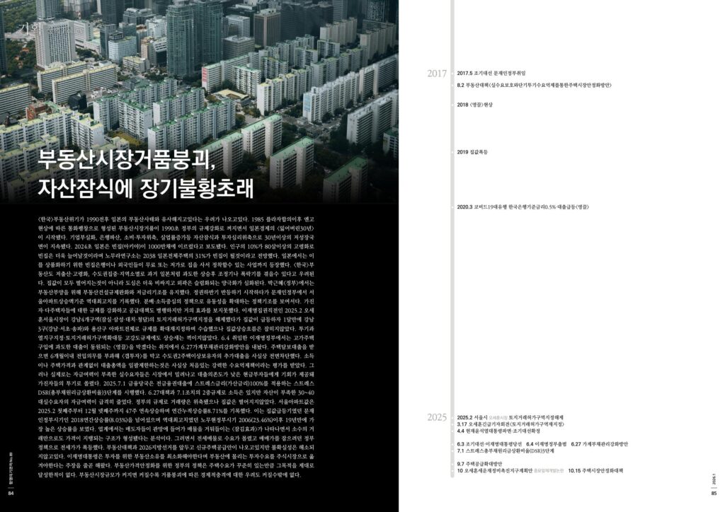 <한국>부동산위기가 1990전후 일본의 부동산사태와 유사해지고있다는 우려가 나오고있다. 1985 플라자합의이후 엔고현상에 따른 통화팽창으로 형성된 부동산시장거품이 1990초 정부의 규제강화로 꺼지면서 일본경제의 <잃어버린30년>이 시작됐다. 기업부실화, 은행파산, 소비·투자위축, 실업률증가등 자산잠식과 투자심리위축으로 30년이상의 저성장국면이 지속됐다. 2024초 일본은 빈집(아키야)이 1000만채에 이르렀다고 보도됐다. 인구의 10%가 80살이상의 고령화로 빈집은 더욱 늘어날것이라며 노무라연구소는 2038 일본전체주택의 31%가 빈집이 될것이라고 전망했다. 일본에서는 이를 상품화하기 위한 빈집은행이나 외국인들이 무료 또는 저가로 집을 사서 정착할수 있는 사업까지 등장했다. <한국>부동산도 저출산·고령화, 수도권집중·지역소멸로 과거 일본처럼 과도한 상승후 조정기나 폭락기를 겪을수 있다고 우려된다. 집값이 모두 떨어지는것이 아니라 도심은 더욱 비싸지고 외곽은 슬럼화되는 양극화가 심화된다. 박근혜<정부>에서는 부동산부양을 위해 부동산건설규제완화와 저금리기조를 유지했다. 정권하반기 반등하기 시작하다가 문재인정부에서 서울아파트상승액기준 역대최고치를 기록했다. 분배·소득중심의 정책으로 유동성을 확대하는 정책기조를 보여서다. 가진자·다주택자들에 대한 규제를 강화하고 공급대책도 병행하지만 거의 효과를 보지못했다. 이재명집권직전인 2025.2 오세훈서울시장이 강남4개구역(잠실·삼성·대치·청담)의 토지거래허가구역지정을 해제했다가 집값이 급등하자 1달만에 강남3구(강남·서초·송파)와 용산구 아파트전체로 규제를 확대재지정하며 수습했으나 집값상승흐름은 잡히지않았다. 투기과열지구지정·토지거래허가구역확대등 고강도규제에도 상승세는 꺽이지않았다. 6.4 취임한 이재명정부에서는 고가주택구입에 과도한 대출이 동원되는 <영끌>을 막겠다는 취지에서 6.27가계부채관리강화방안을 내놨다. 주택담보대출을 받으면 6개월이내 전입의무를 부과해 <갭투자>를 막고 수도권2주택이상보유자의 추가대출을 사실상 전면차단했다. 소득이나 주택가격과 관계없이 대출총액을 일괄제한하는것은 사실상 처음있는 강력한 수요억제책이라는 평가를 받았다. 그러나 실제로는 자금여력이 부족한 실수요자들은 시장에서 밀려나고 대출의존도가 낮은 현금부자들에게 기회가 제공돼 가진자들의 투기로 쏠렸다. 2025.7.1 금융당국은 전금융권대출에 스트레스금리(가산금리)100%를 적용하는 스트레스DSR(총부채원리금상환비율)3단계를 시행했다. 6.27대책과 7.1조치의 2중규제로 소득은 있지만 자산이 부족한 30~40대실수요자의 자금여력이 급격히 줄었다. 정부의 규제로 거래량은 위축됐으나 집값은 떨어지지않았다. 서울아파트값은 2025.2 첫째주부터 12월 넷째주까지 47주 연속상승하며 연간누적상승률8.71%를 기록했다. 이는 집값급등기였던 문재인정부시기인 2018연간상승률(8.03%)을 넘어섰으며 역대최고치였던 노무현정부시기 2006(23.46%)이후 19년만에 가장 높은 상승률을 보였다. 업계에서는 매도자들이 관망에 들어가 매물을 거둬들이는 <잠김효과>가 나타나면서 소수의 거래만으로도 가격이 지탱되는 구조가 형성됐다는 분석이다. 그러면서 전세매물로 수요가 몰렸고 매매가를 잡으려던 정부정책으로 전세가가 폭등했다. 부동산대책과 2026지방선거를 앞두고 신규주택공급안이 나오고있지만 불확실성은 해소되지않고있다. 이재명대통령은 투자를 위한 부동산소유를 최소화해야한다며 부동산에 몰리는 투자수요를 주식시장으로 옮겨야한다는 주장을 줄곧 해왔다. 부동산가격안정화를 위한 정부의 정책은 주택수요가 꾸준히 있는만큼 그목적을 제대로 달성한적이 없다. 부동산시장규모가 커지면 커질수록 거품붕괴에 따른 경제적충격에 대한 우려도 커질수밖에 없다.